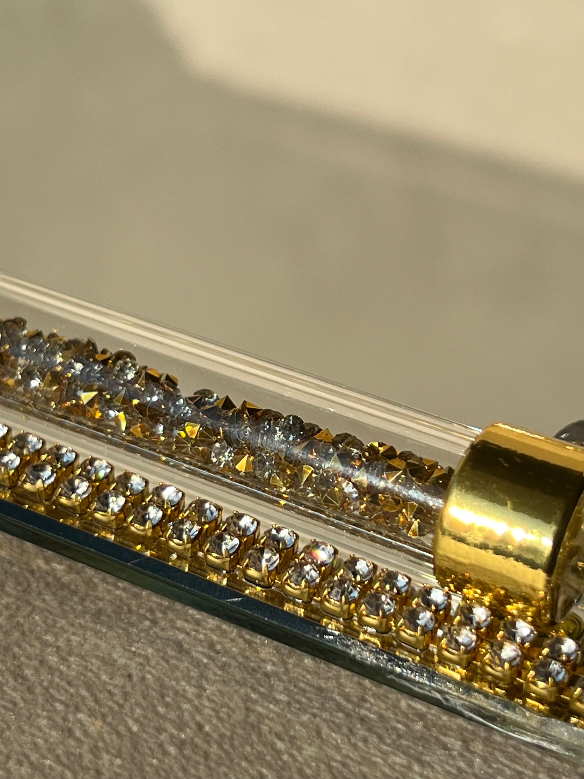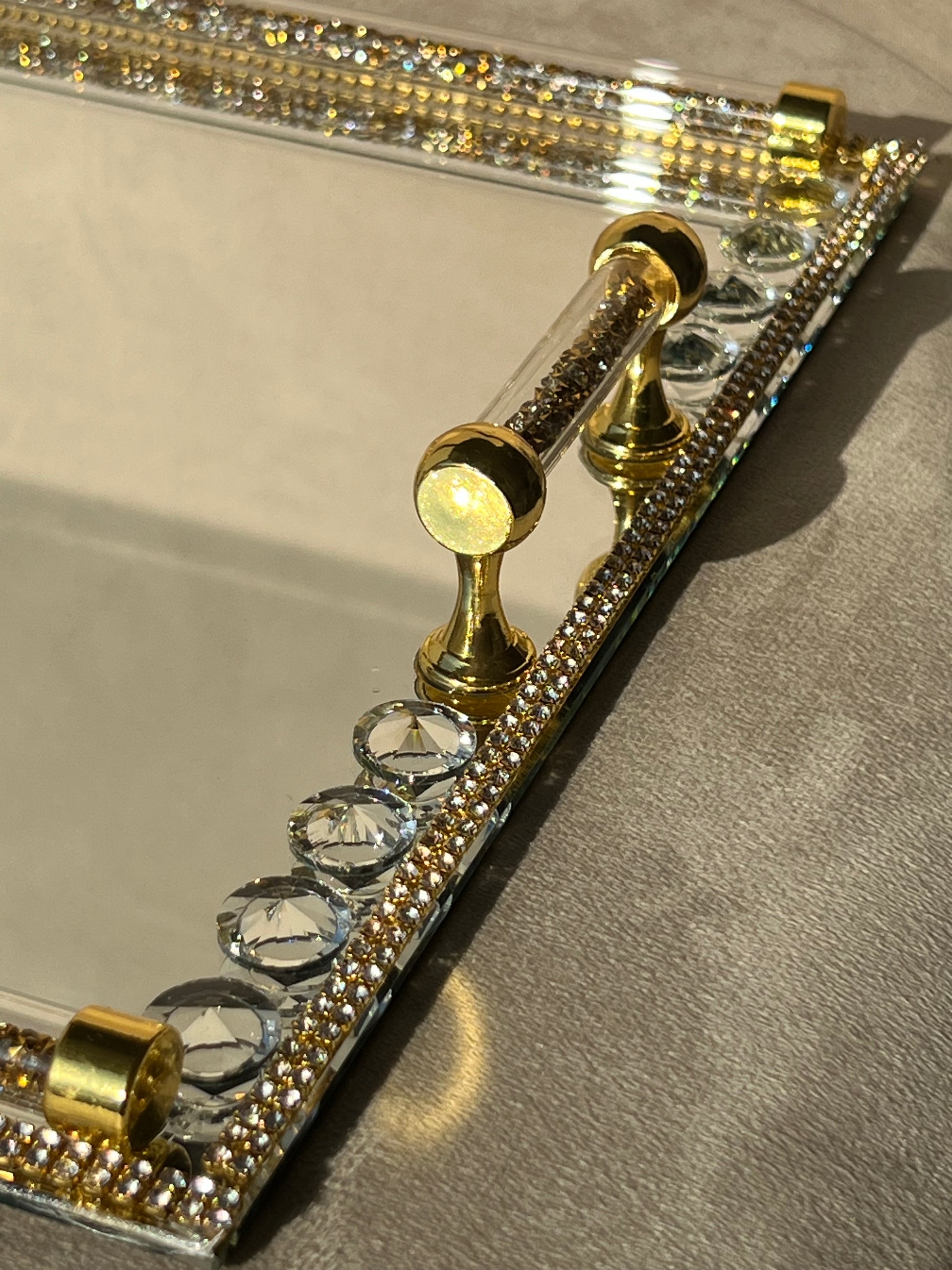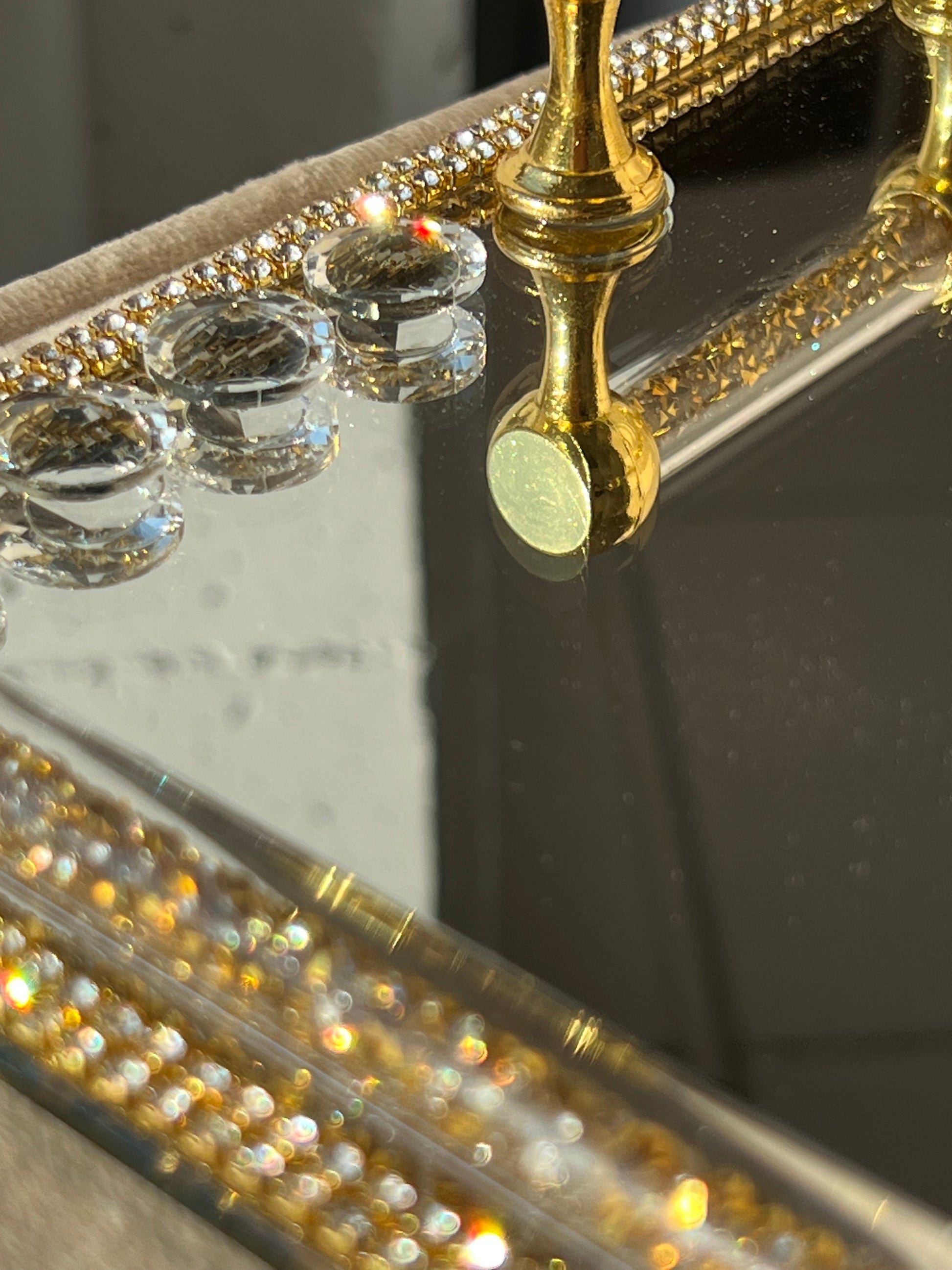 Esta elegante bandeja de espejo es el complemento perfecto para quienes buscan un toque de sofisticación en su hogar. Con un marco adornado con detalles dorados brillantes y decoraciones de cristal tipo diamante, esta pieza irradia lujo y distinción. Su base de espejo refleja la luz y realza cualquier objeto que se coloque sobre ella, ideal para perfumes, velas, dulces o simplemente como pieza decorativa.