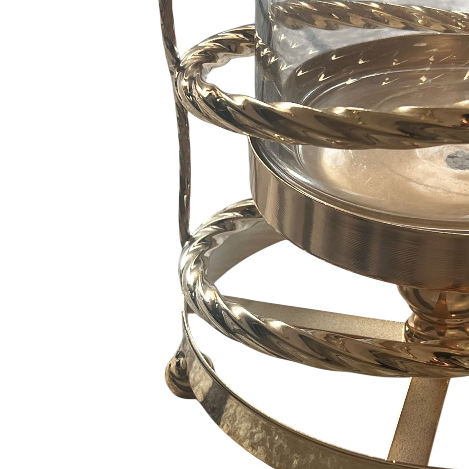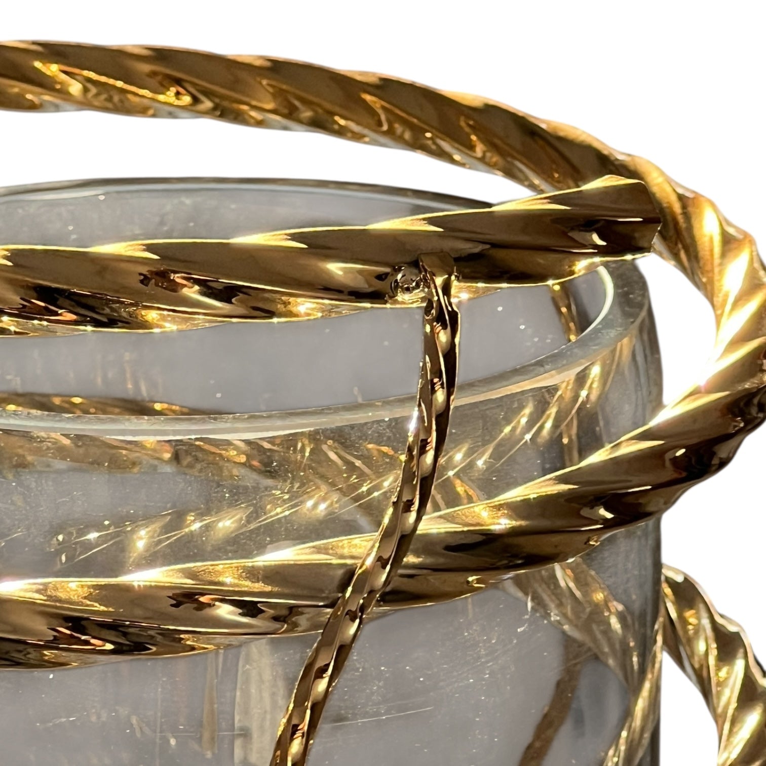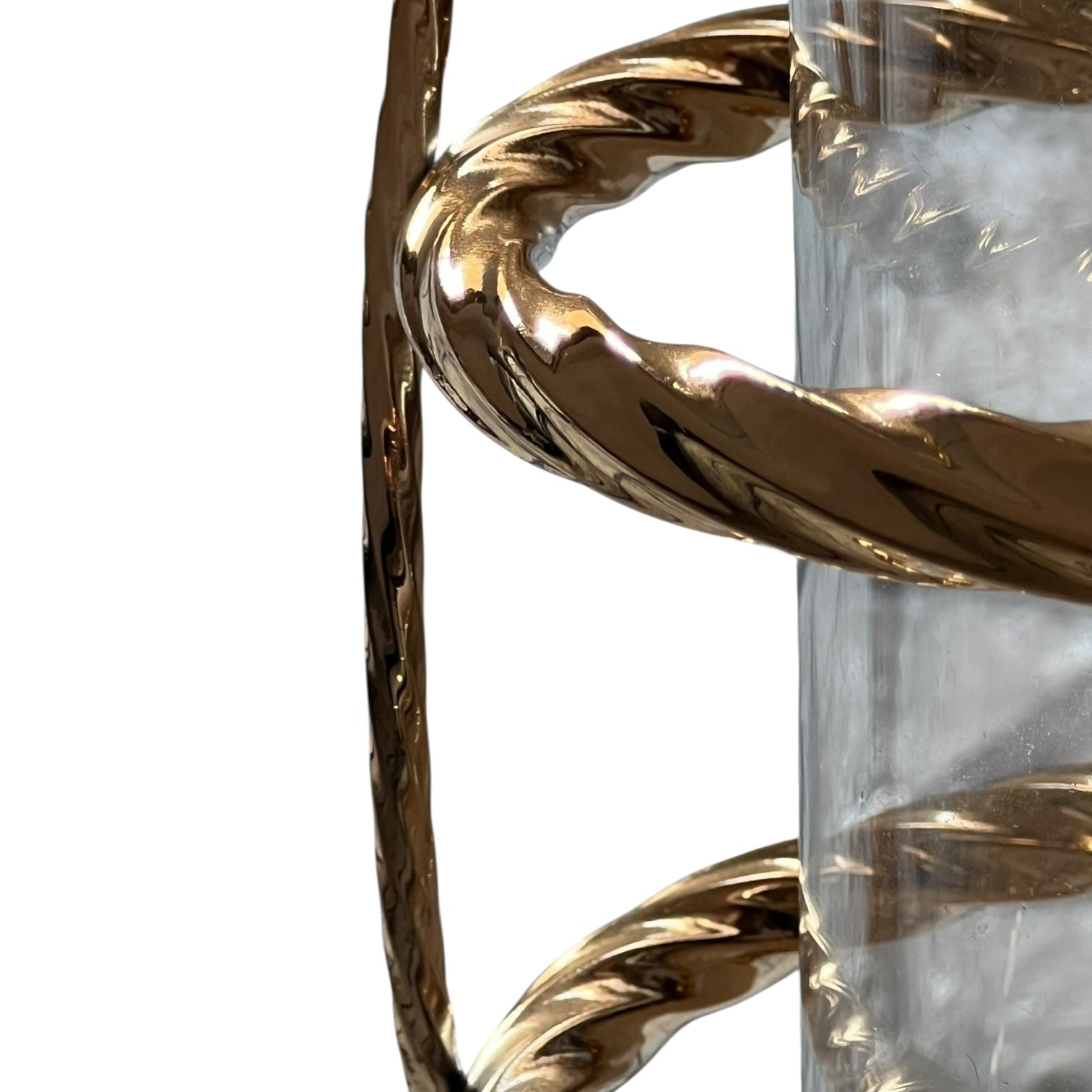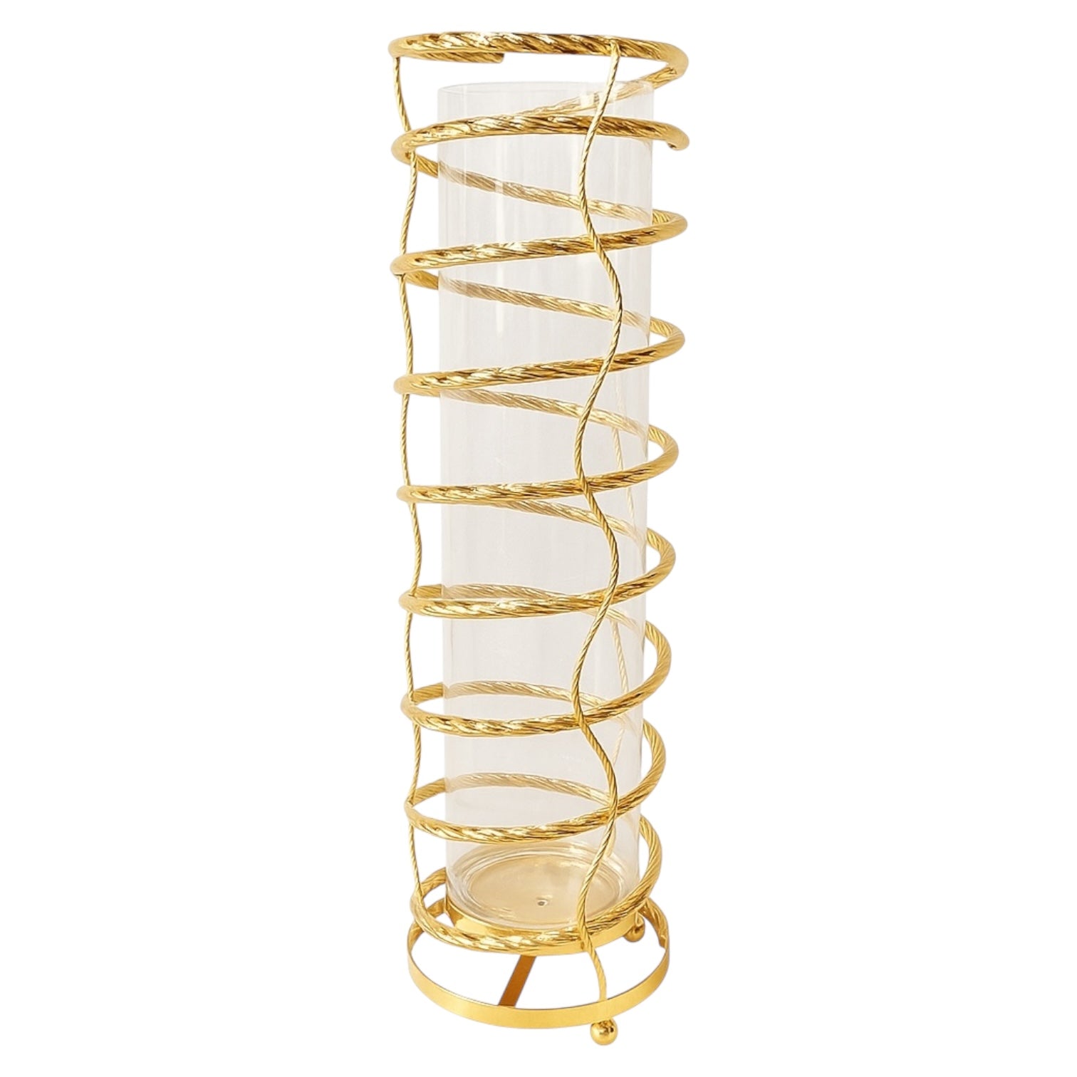 Descubre esta espectacular torre decorativa que une la pureza del cristal con la majestuosidad del metal dorado, creando un elemento impactante para cualquier estancia. Su diseño estilizado, con un cilindro de cristal transparente envuelto en una estructura metálica dorada de forma espiral trenzada, logra un efecto visual lujoso y moderno, perfecto para captar todas las miradas.