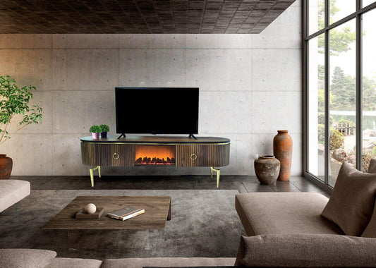 Mesa de TV con chimenea digital - MADERA CON DETALLES EN DORADO