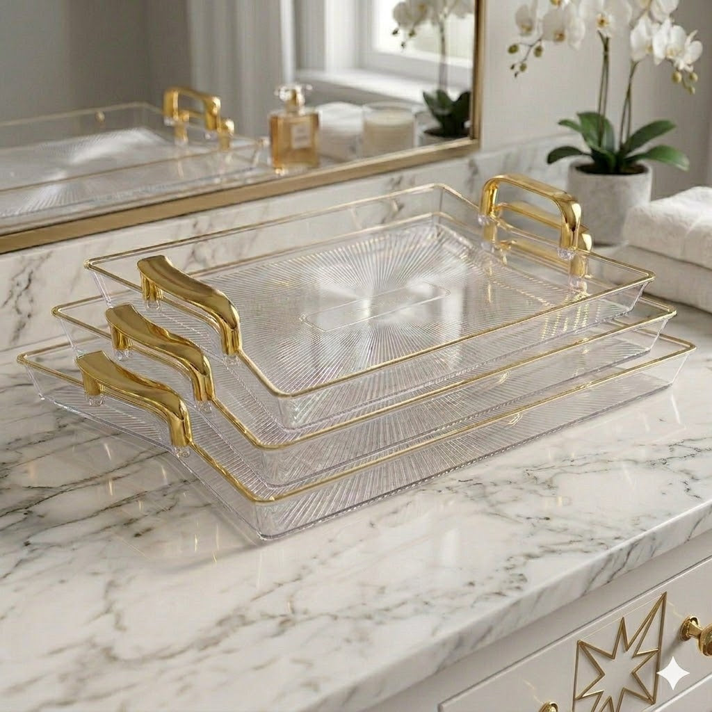 Set of 3 Rectangular Plastic Trays with Gold Handles ✨