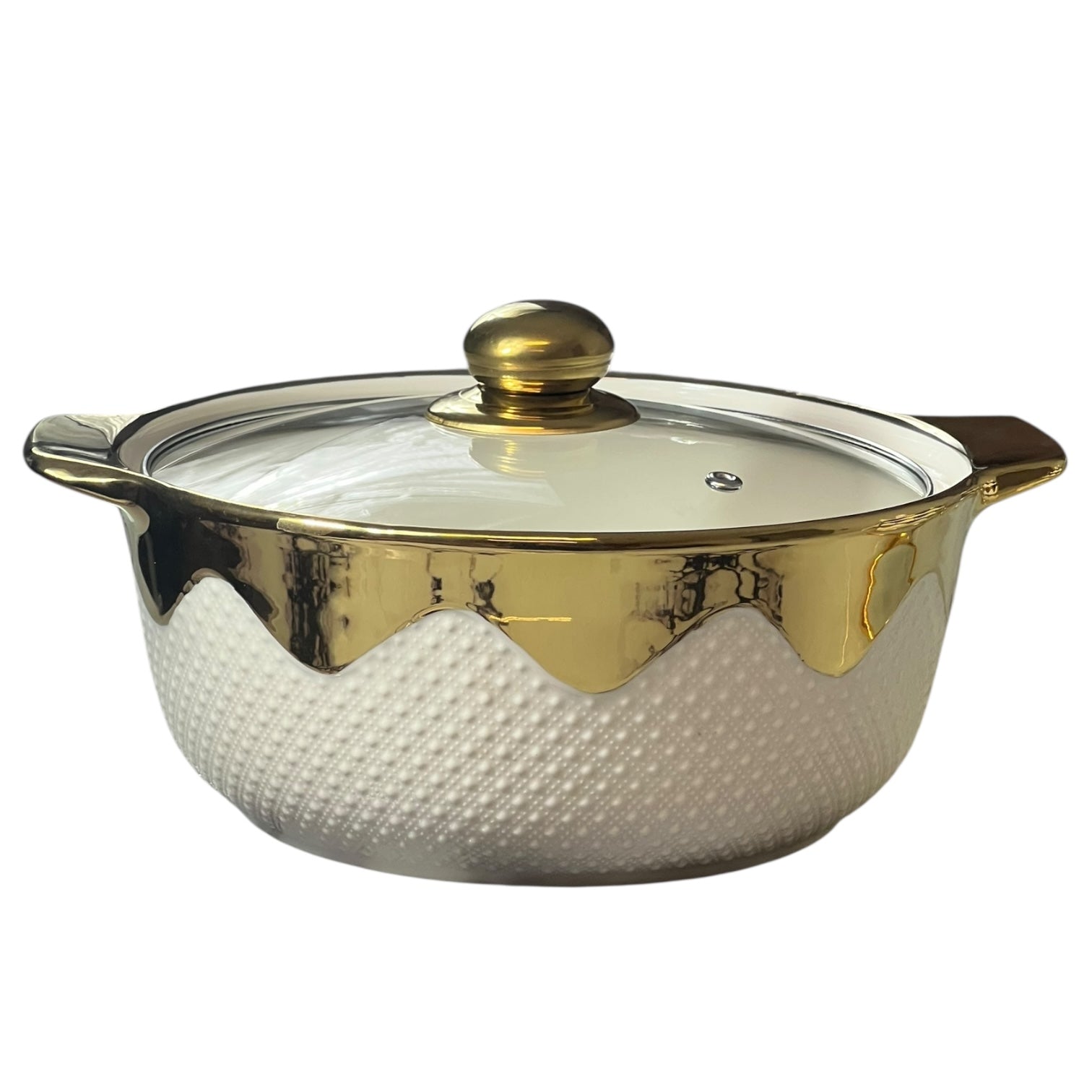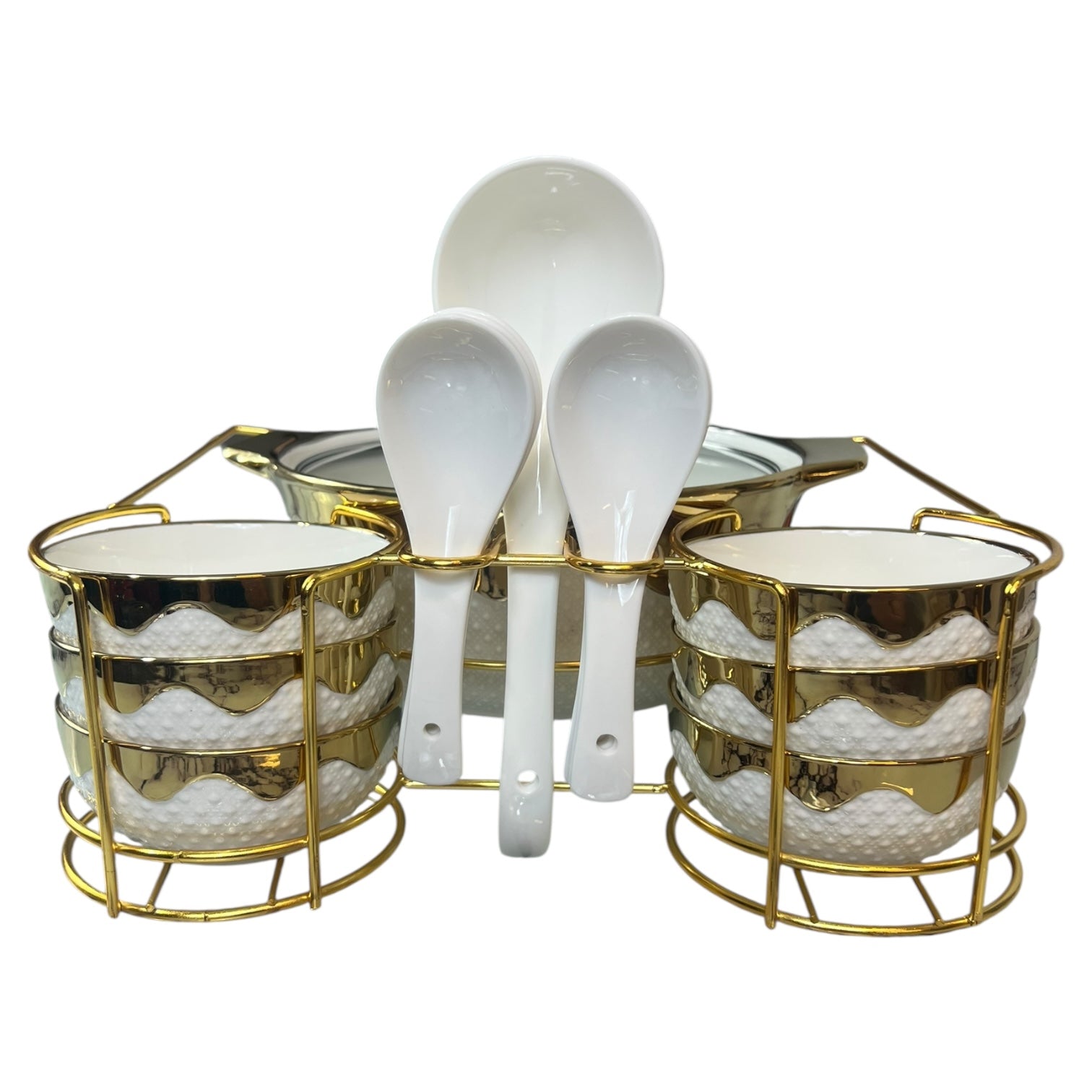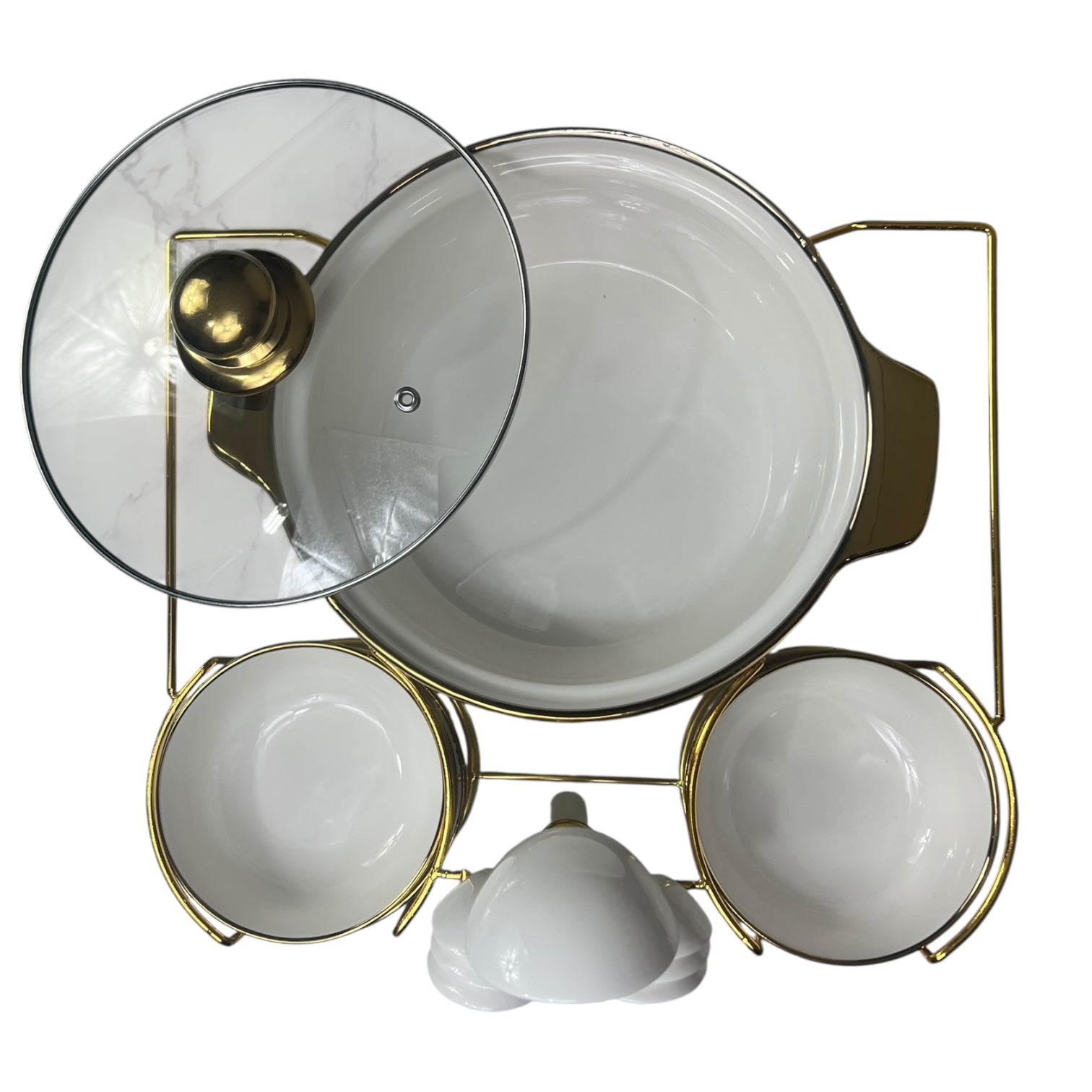 Este set de cocina de 16 piezas es la solución ideal para quienes buscan elegancia y practicidad en su menaje de mesa. Con un diseño sofisticado que combina lo clásico con lo moderno, incluye cazuelas con tapa, cuencos individuales, cucharas y un soporte metálico dorado que lo mantiene todo organizado y siempre a mano.