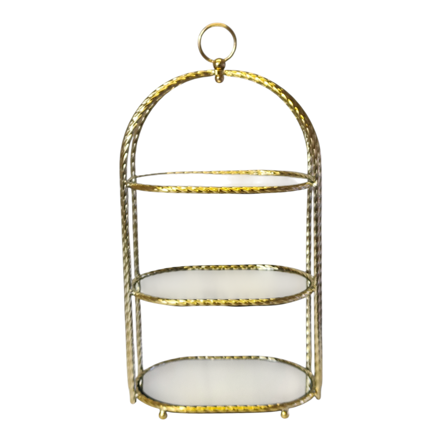 💎 Ideal para tocadores, salones, bodas o eventos especiales, este estante aporta un toque de glamour clásico gracias a su acabado dorado brillante y su forma arqueada con aro superior, que permite moverlo fácilmente o colgarlo si se desea.