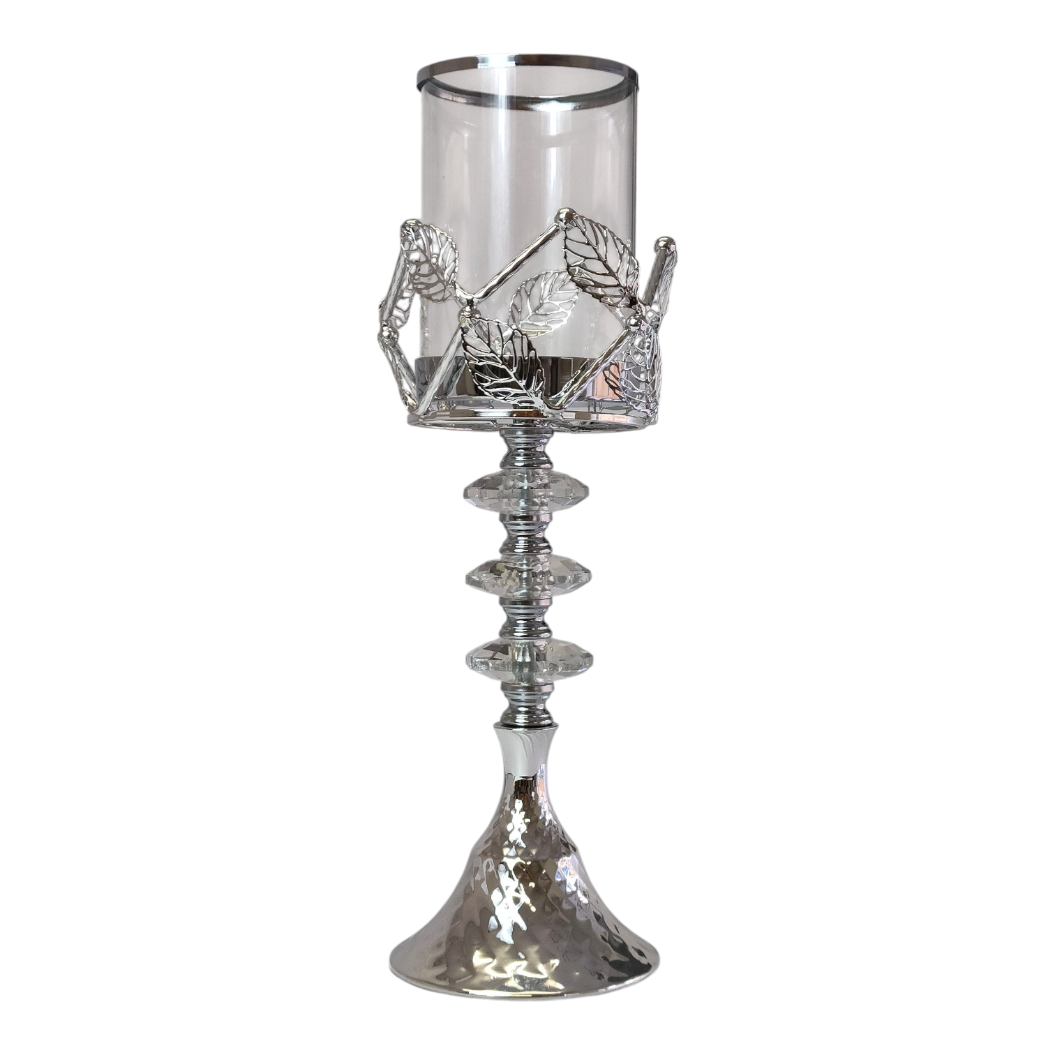 Portavelas de Cristal y Metal Plateado con Detalles de Hojas – 42cm