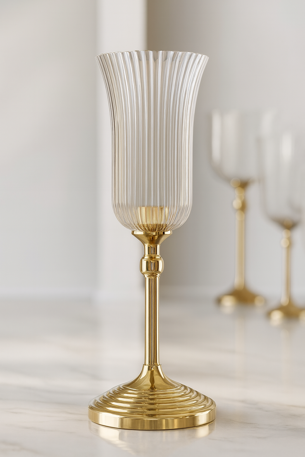 Portavelas de Cristal Acanalado con Base Dorada de Lujo