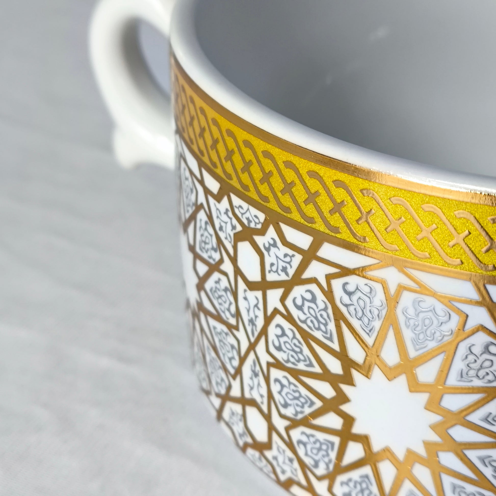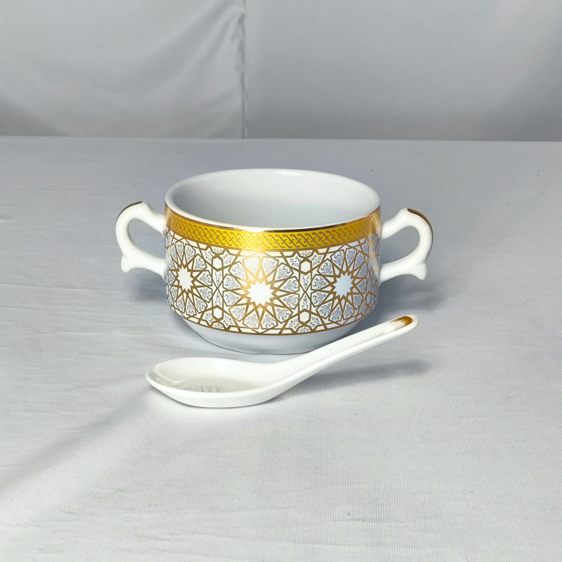 Sopera de Porcelana Blanca con Detalles Dorados y 6 Cuencos con Cucharas – Diseño Geométrico Árabe