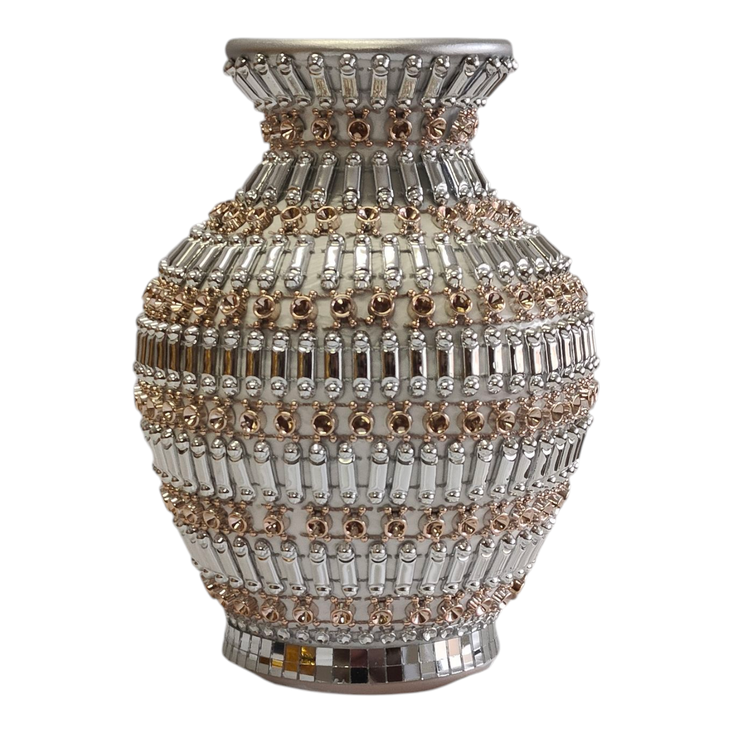 🏺 Jarrón Decorativo Plateado con Detalles Dorados - 20cm