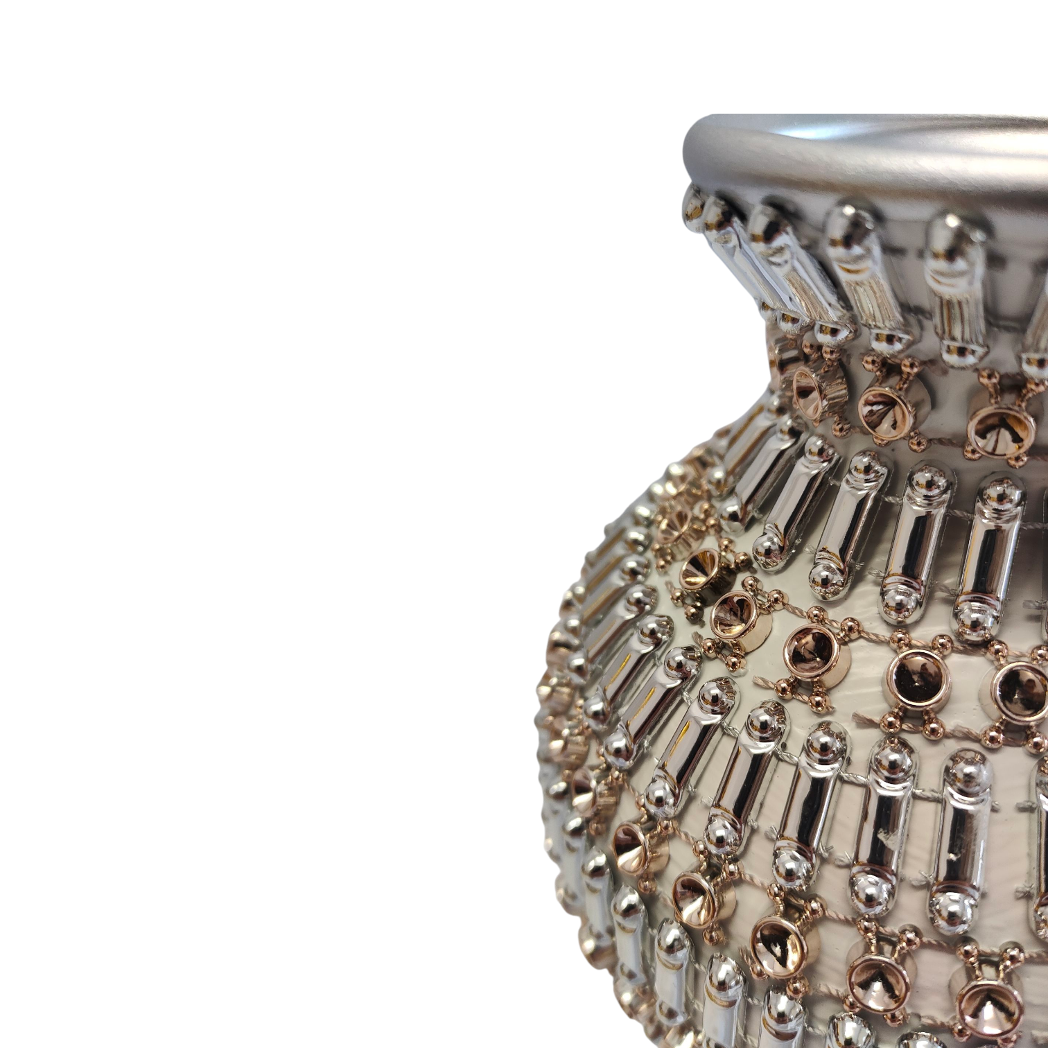 💫 Aporta lujo y distinción a tu hogar con este jarrón decorativo plateado con detalles dorados, una pieza que combina elegancia y brillo en un diseño artesanal único. Su forma redondeada y su acabado metálico con incrustaciones doradas reflejan la luz creando un efecto visual deslumbrante.