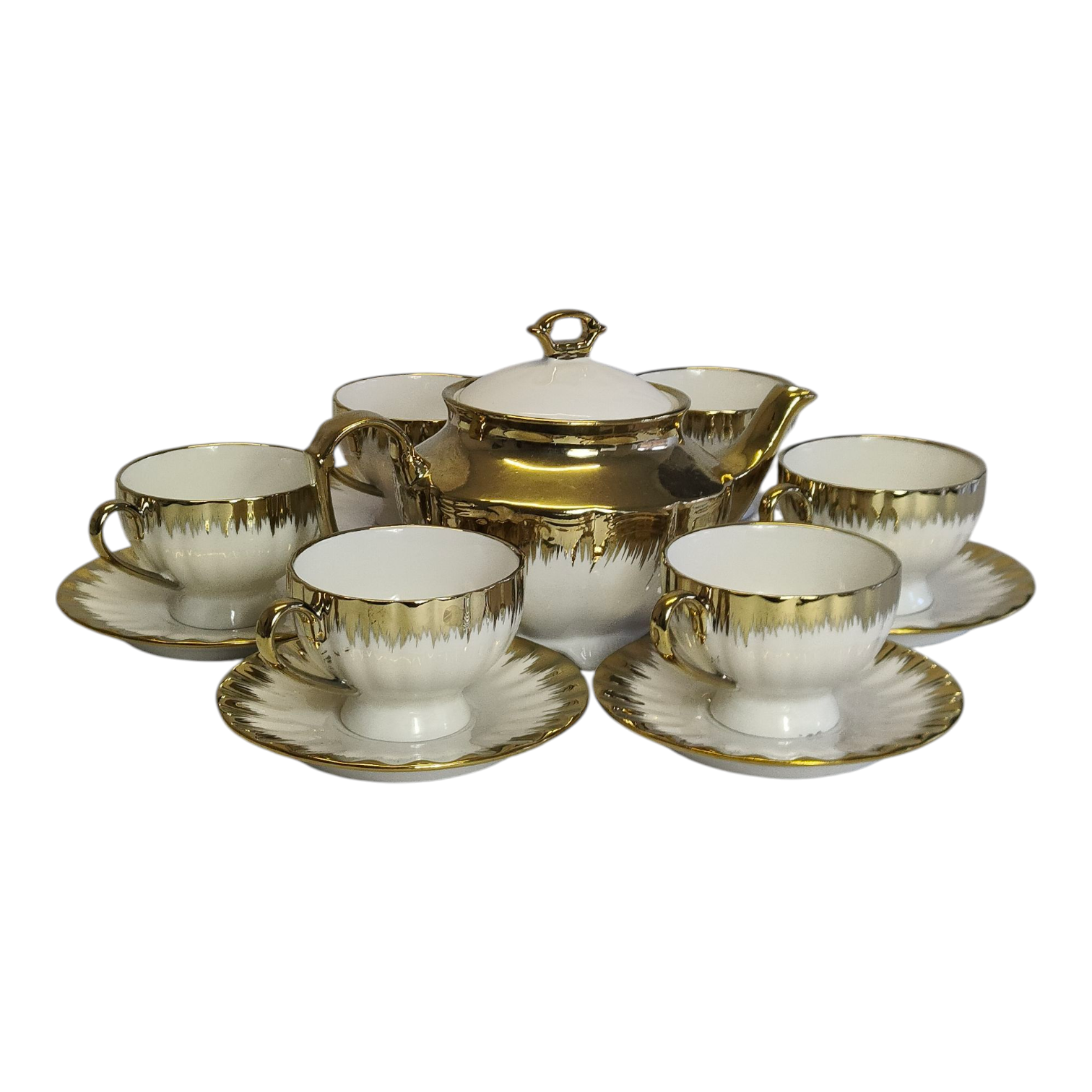 ☕✨ Disfruta tus momentos de té con elegancia con este juego de té de porcelana decorado con acabado dorado brillante. Su diseño clásico y sofisticado aporta un toque de lujo a cualquier mesa, ideal para ocasiones especiales o para sorprender a tus invitados.