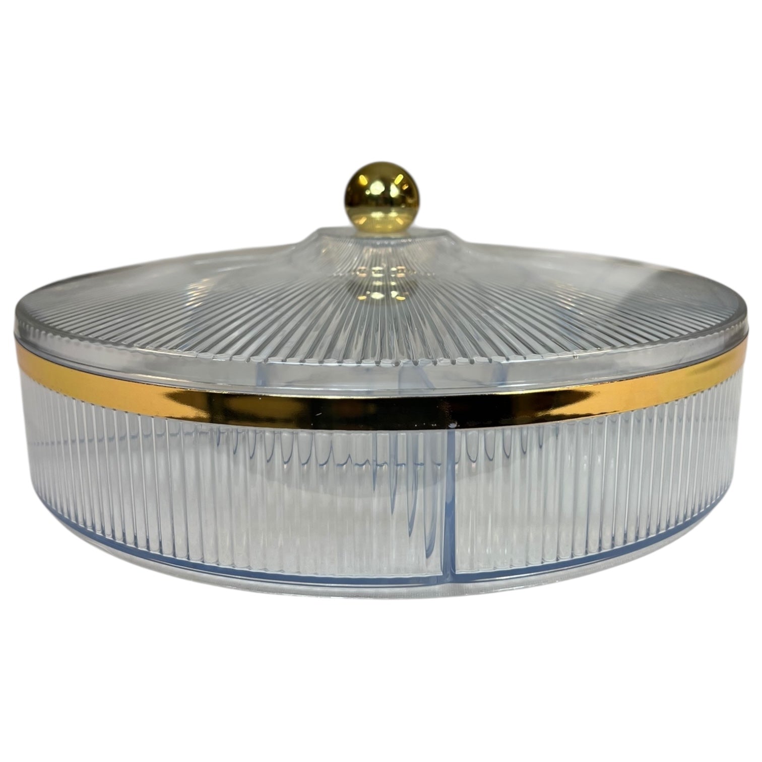 Este elegante dulcero redondo con tapa y detalle dorado es perfecto para organizar y presentar dulces, frutos secos o snacks con estilo. Su diseño con acabado texturizado y compartimentos internos lo convierte en una pieza funcional y decorativa, ideal para el salón, la cocina o como centro de mesa en ocasiones especiales.