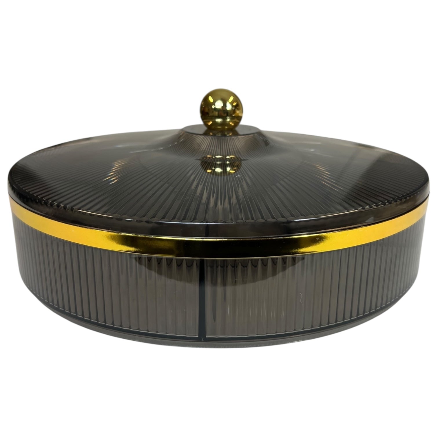Este elegante dulcero redondo con tapa y detalle dorado es perfecto para organizar y presentar dulces, frutos secos o snacks con estilo. Su diseño con acabado texturizado y compartimentos internos lo convierte en una pieza funcional y decorativa, ideal para el salón, la cocina o como centro de mesa en ocasiones especiales.