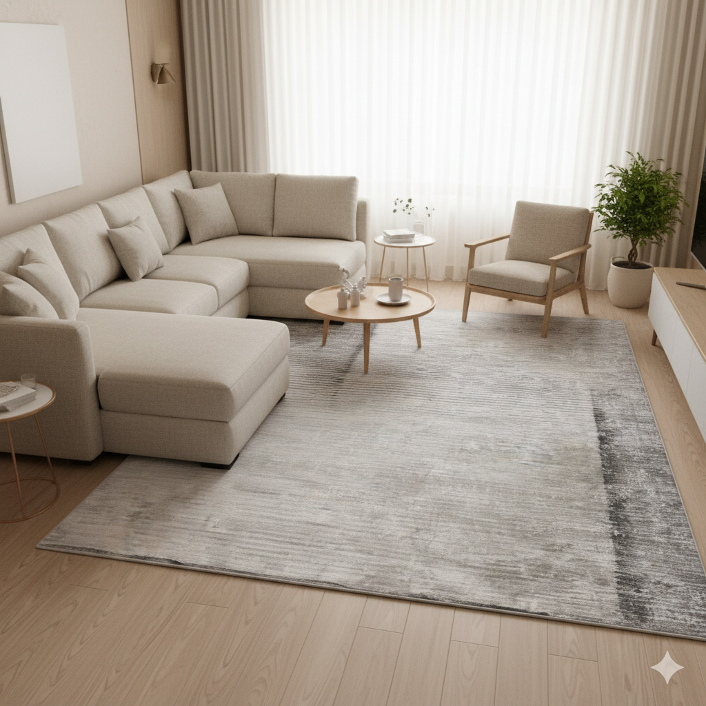 Alfombra de diseño moderno con delicadas líneas horizontales y un suave degradado en tonos gris perla y gris humo. Su aspecto minimalista y elegante aporta calma visual y combina perfecto con salones y dormitorios de estilo contemporáneo o nórdico. Disponible en 160×230 cm y 200×280 cm.