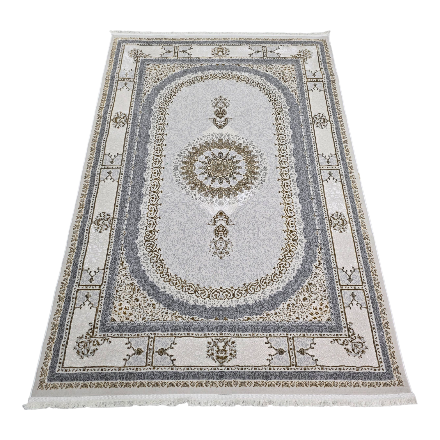 Alfombra NADOR Crema y Gris Claro con Medallón Clásico y Detalles Elegantes ✨🤍🩶 — Estilo Turco Sofisticado para Salón, Dormitorio y Pasillo