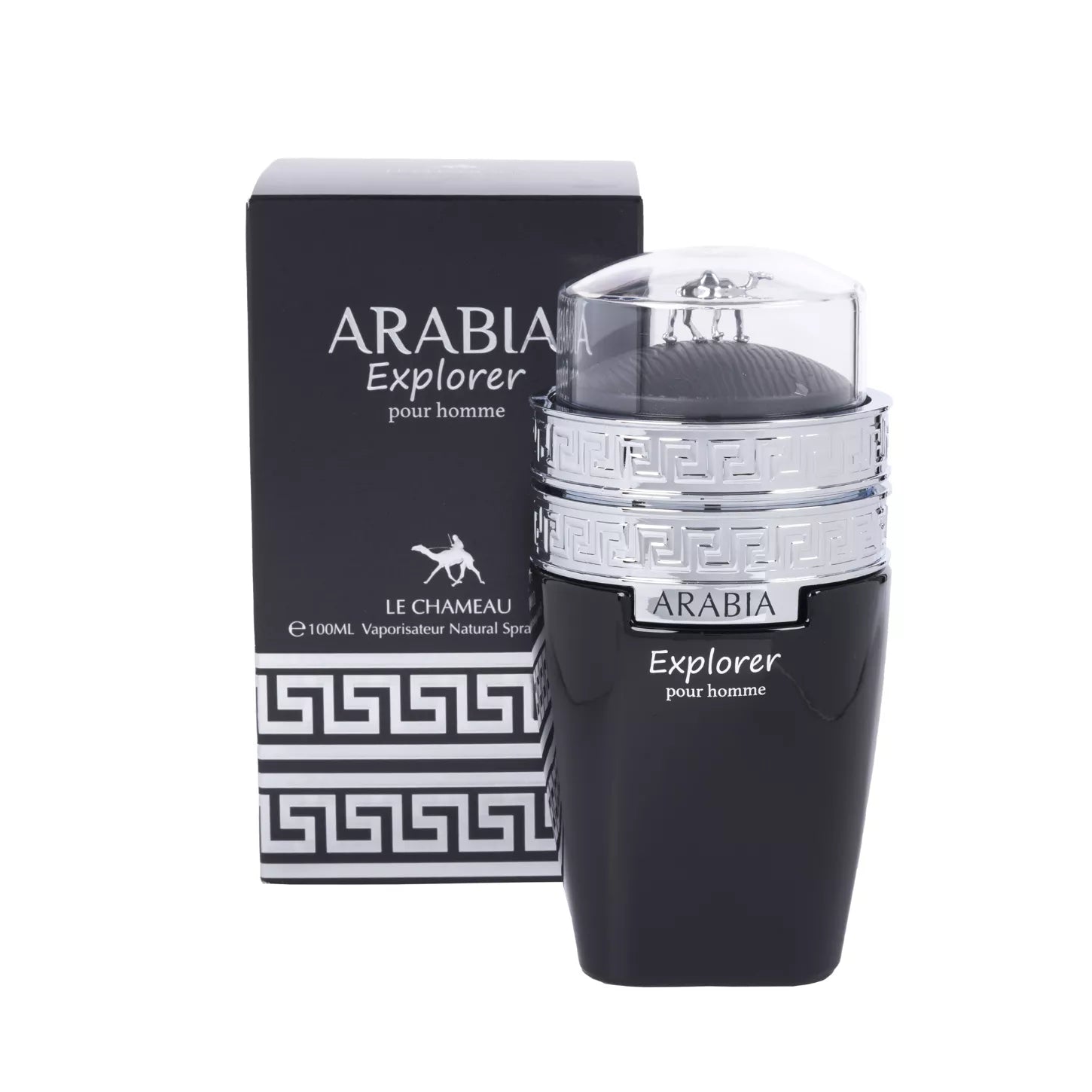 El frasco de Arabia Explorer refleja la elegancia y el lujo de la fragancia, con un diseño sofisticado que evoca la riqueza de la cultura oriental.