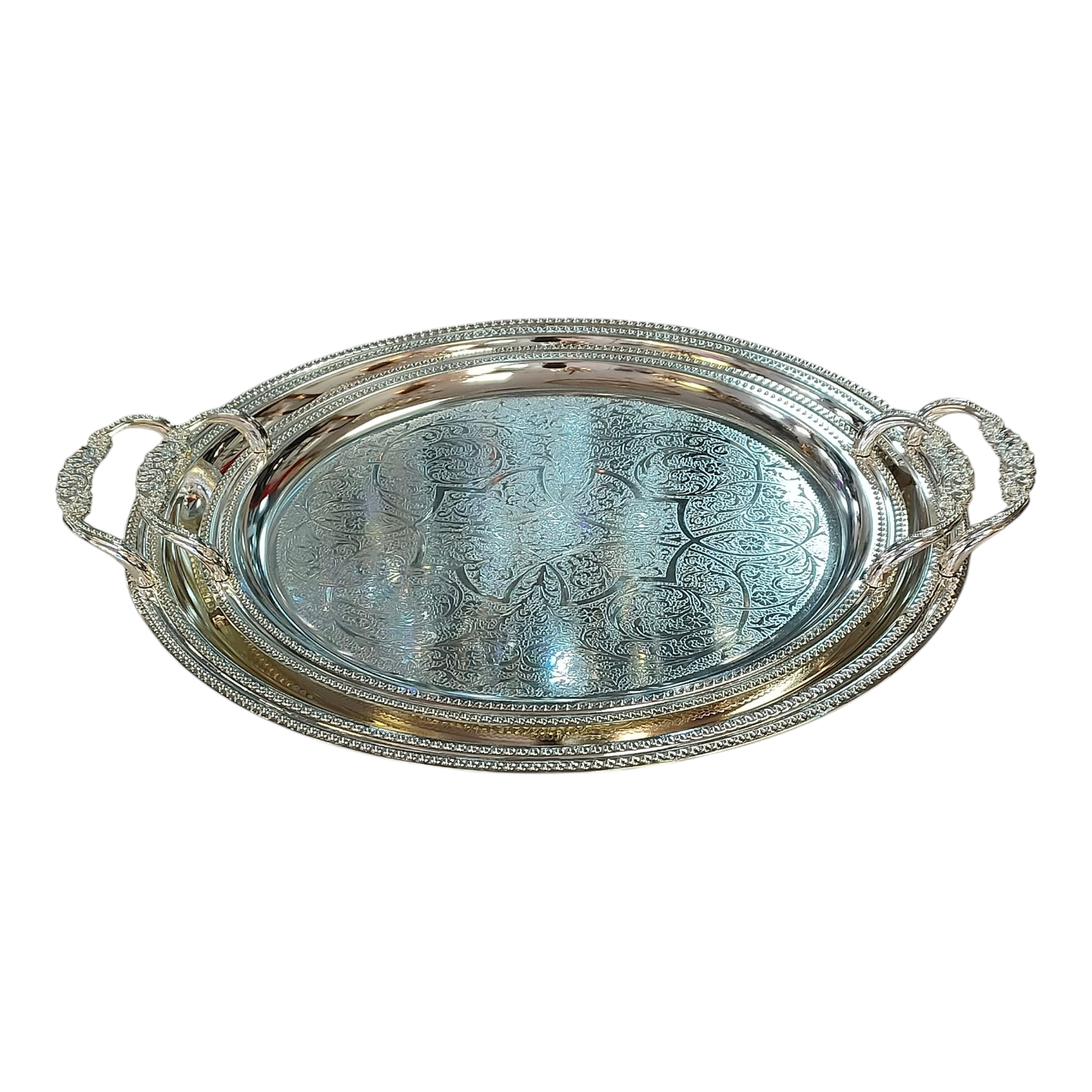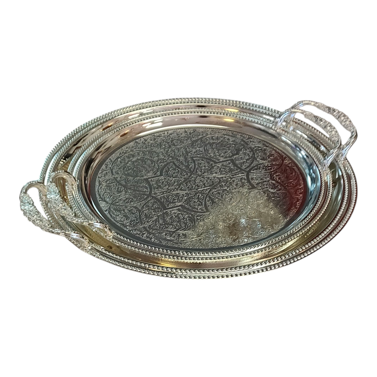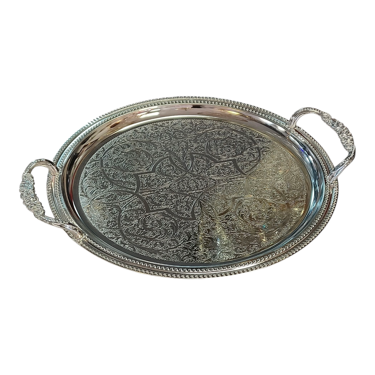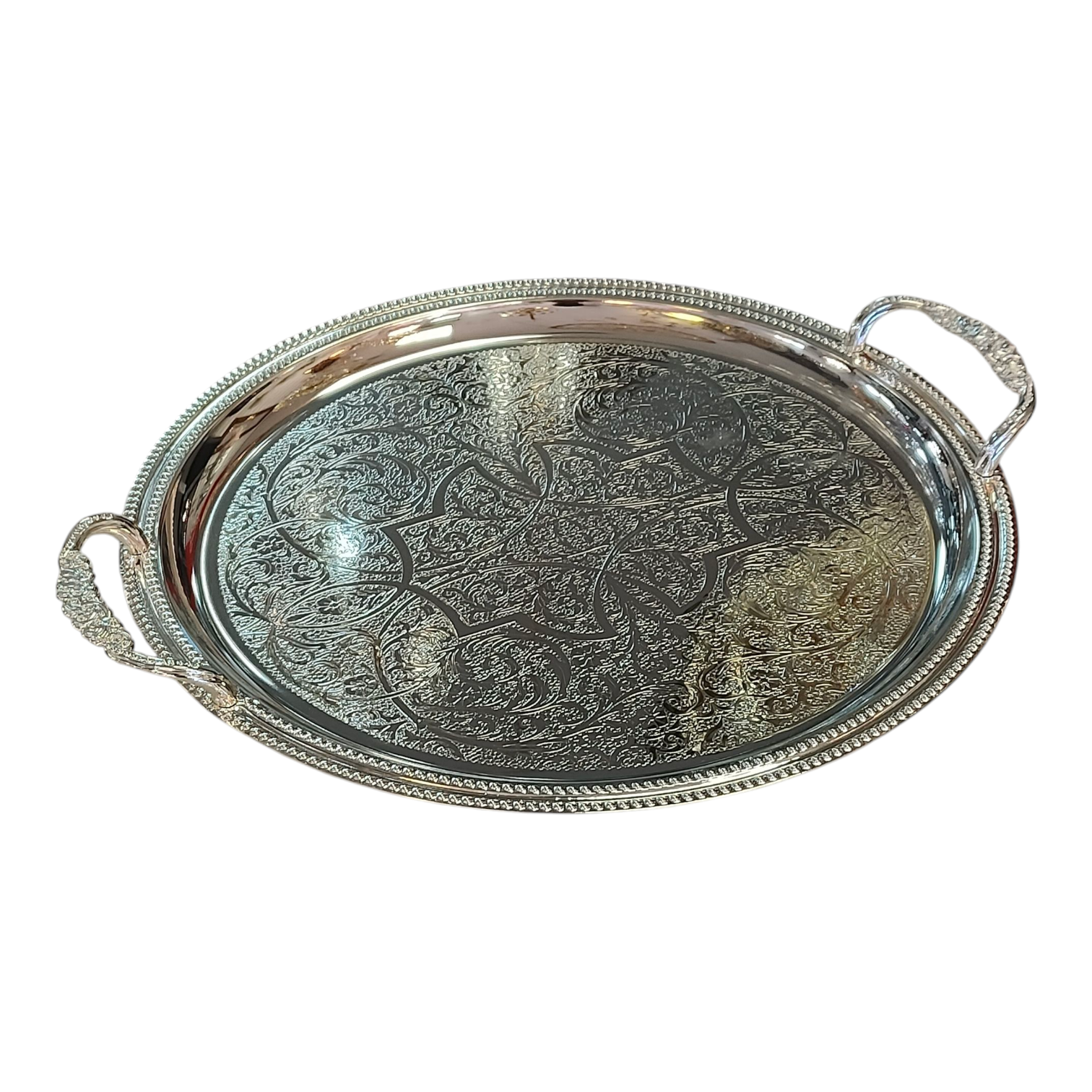 Bandeja Redondeada Plateada Grabada con Asas Texturizadas