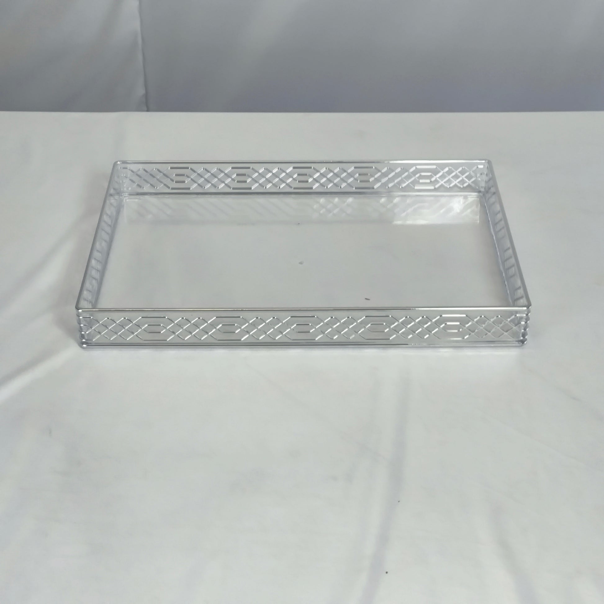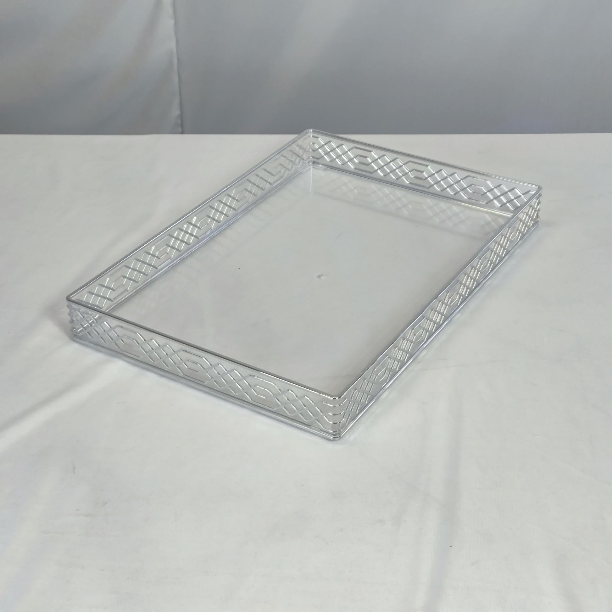 Dale un toque moderno y elegante a cualquier espacio con esta bandeja acrílica transparente de diseño geométrico. Perfecta para servir, organizar o decorar con estilo.
