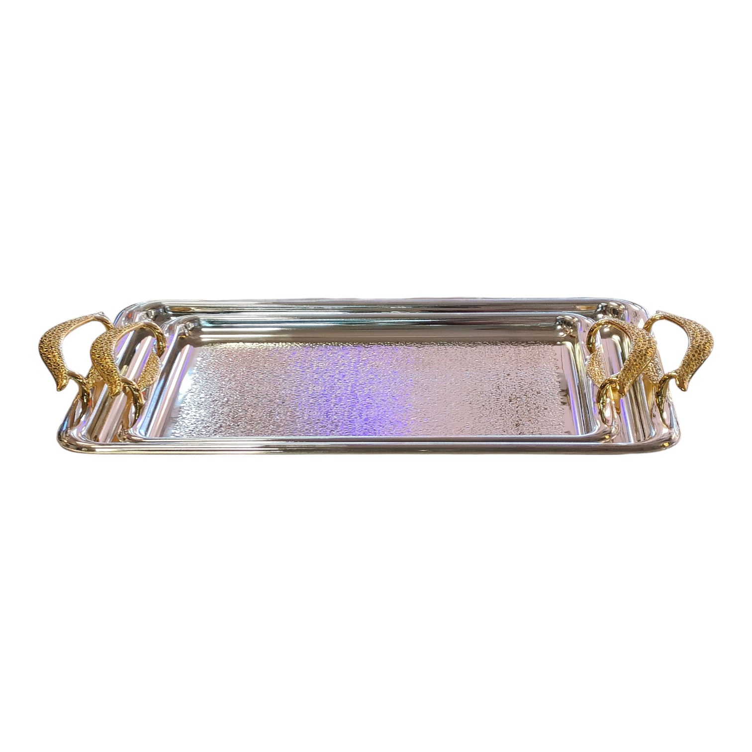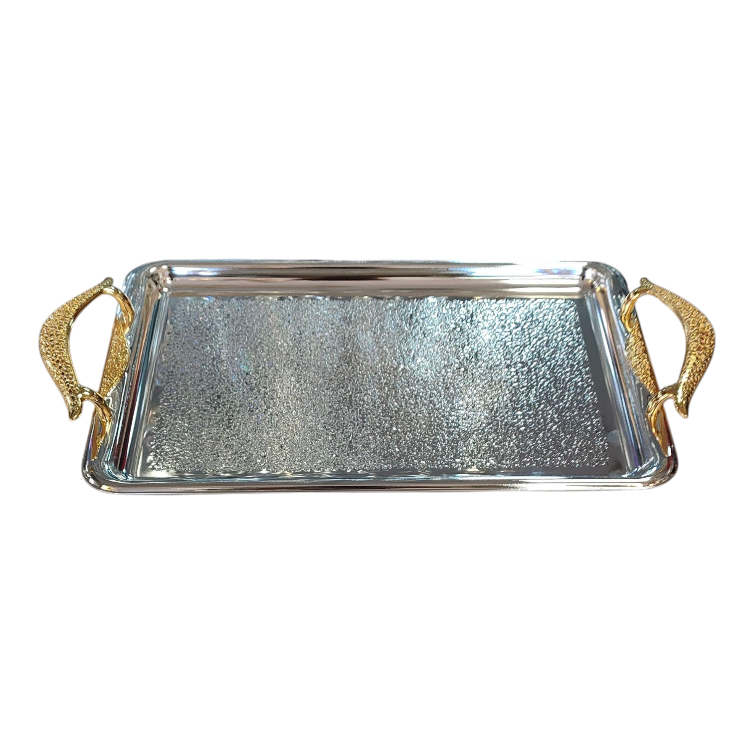 Bandeja Rectangular Plateada con Asas Doradas de Lujo