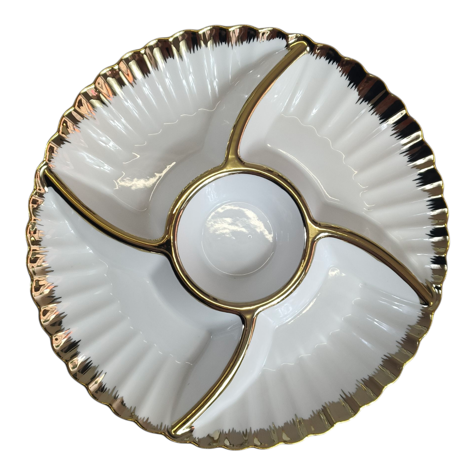 Este elegante plato redondo con divisiones es ideal para servir aperitivos, frutos secos, dulces o salsas con un toque distinguido. Su diseño blanco con borde y divisores dorados le aporta un estilo sofisticado y moderno, perfecto para ocasiones especiales o para realzar tu mesa en el día a día.