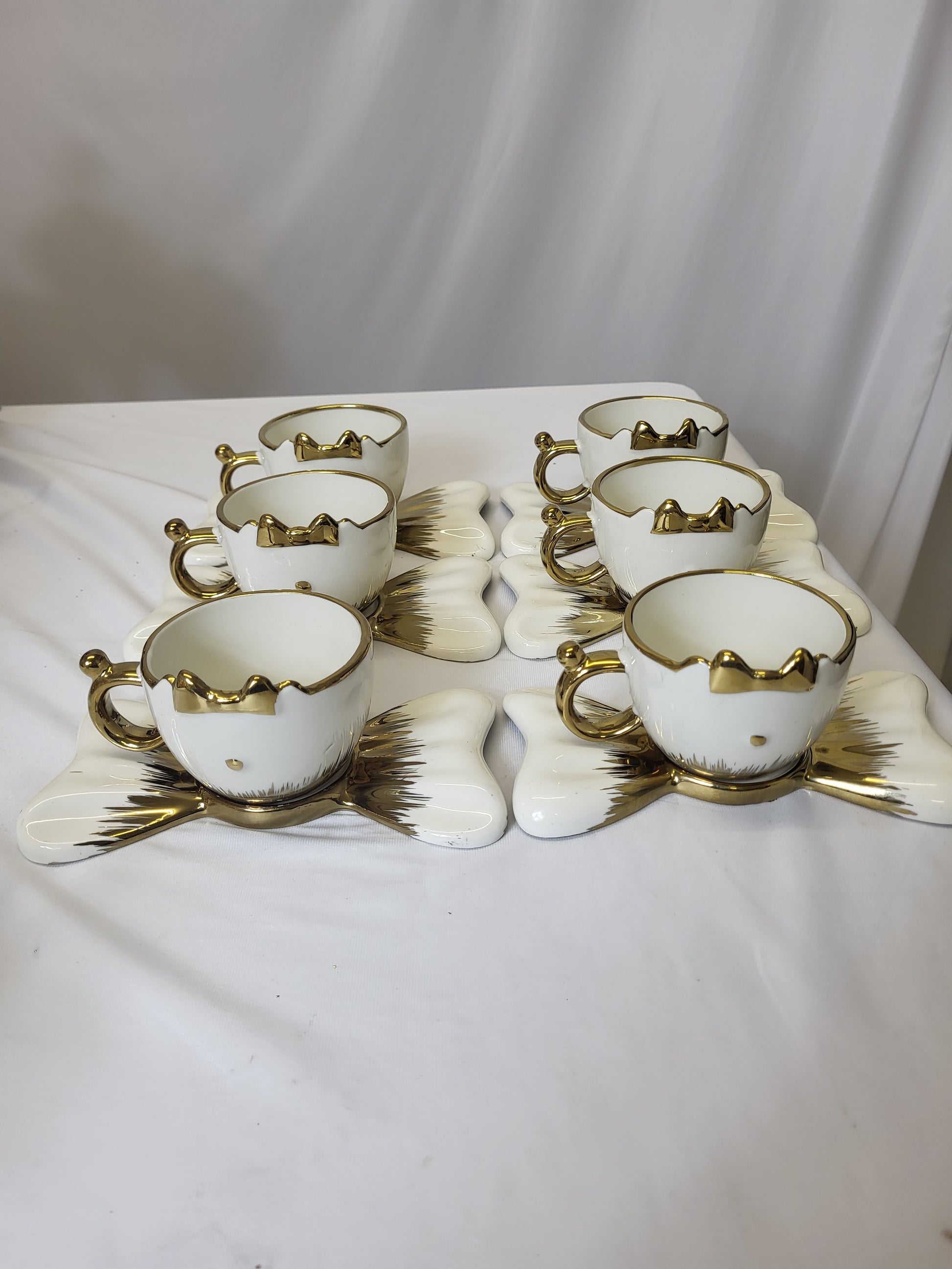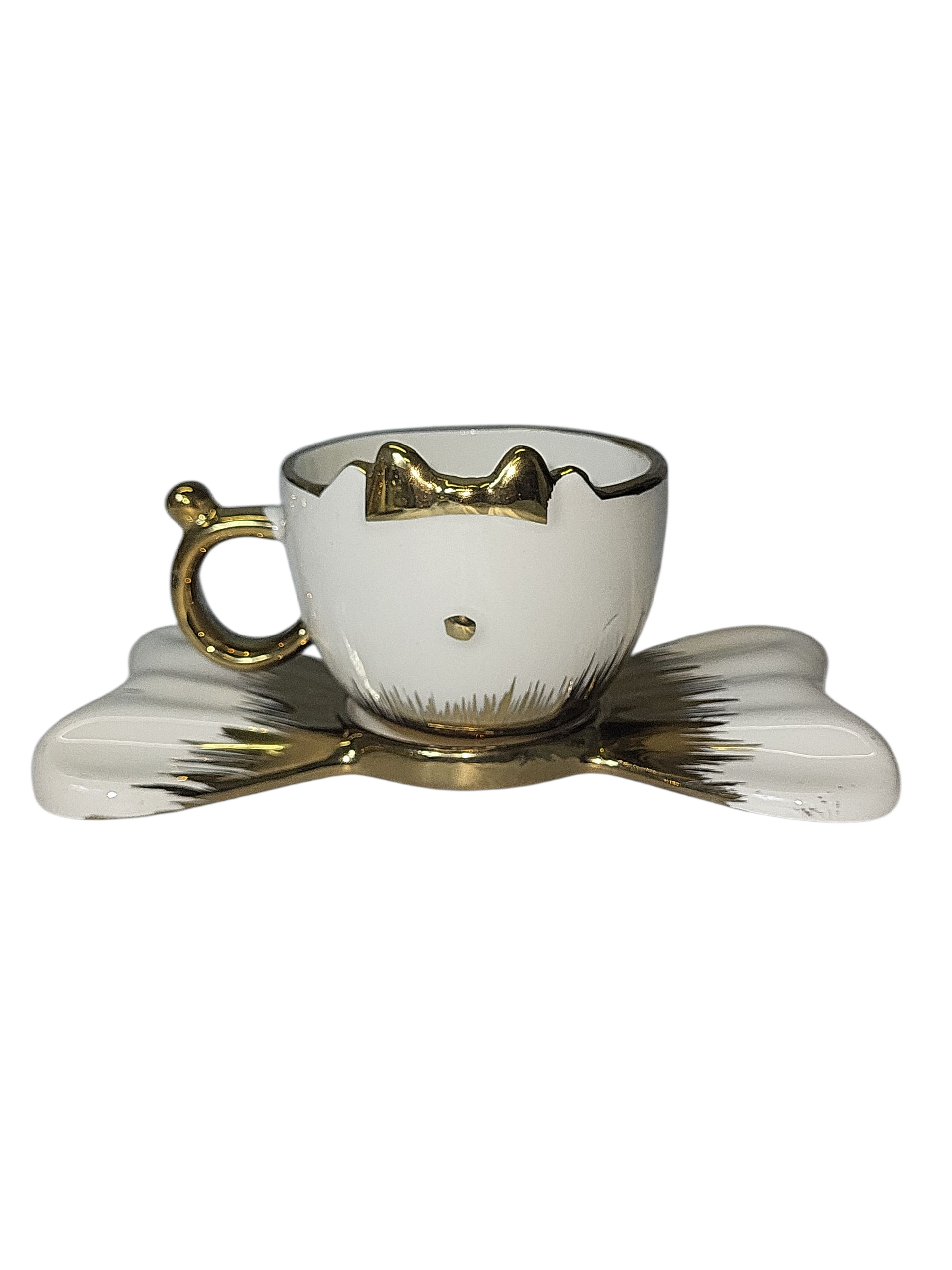 Set completo de 6 tazas de café espresso con bandeja a juego 🤍. Cada taza tiene forma de carita de gatito con sus orejitas y lazo en dorado 💛 y un asa dorada elegante que le da un toque de lujo. La parte baja tiene acabado dorado brillante que contrasta con el blanco, creando un diseño muy fino para servir café a tus invitados ☕.