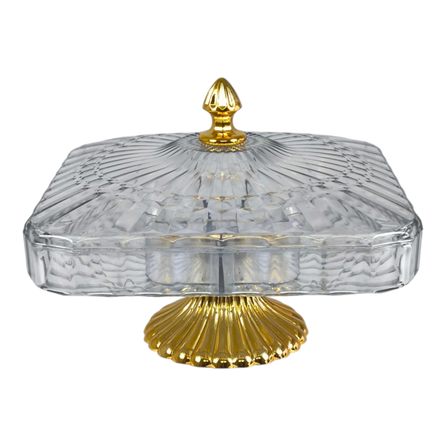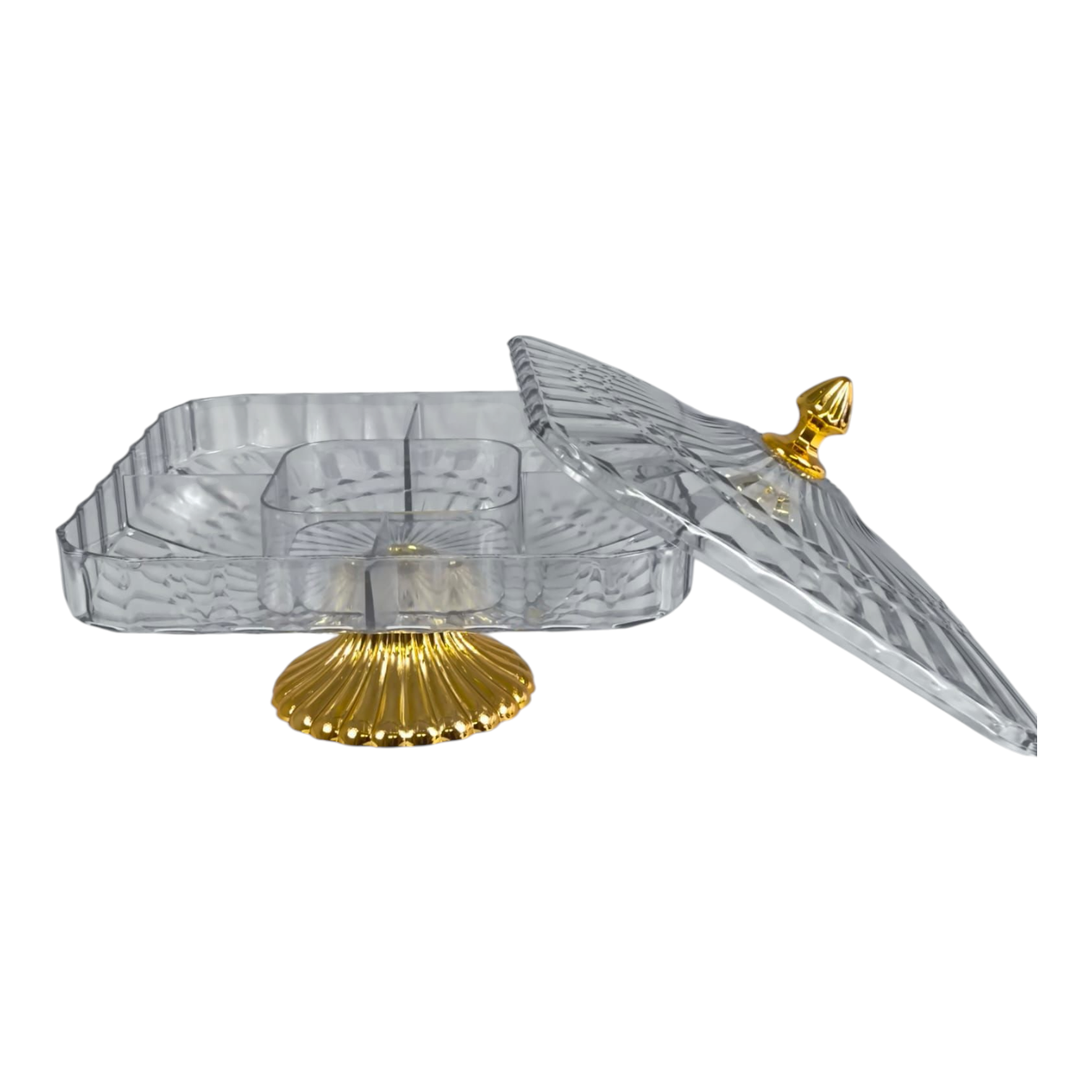🍬 Bandeja Expositora Cuadrada de Plástico con Tapa y Base Dorada – Elegancia y Organización ✨