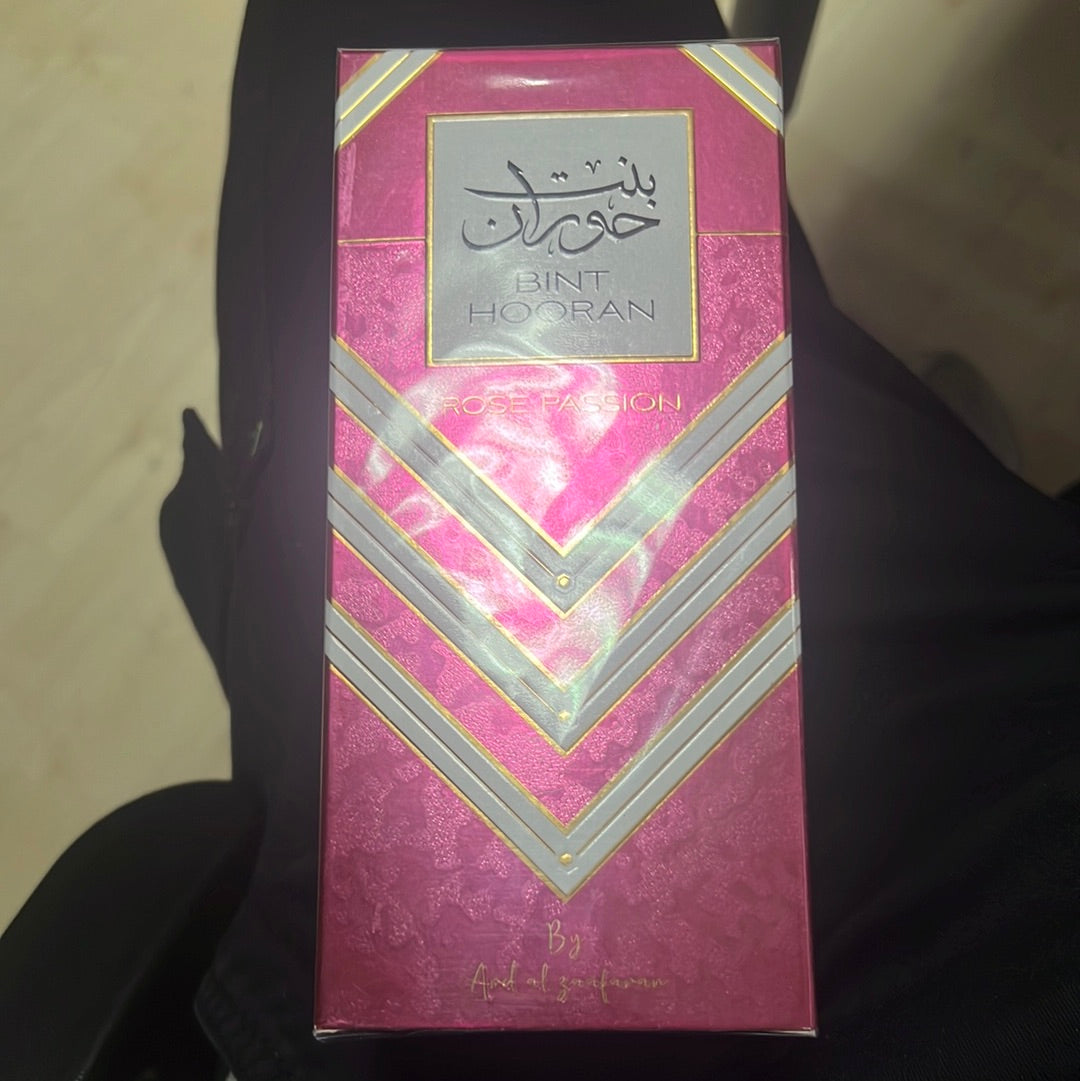 El frasco de Bint Hooran Rose Passion destaca por su diseño elegante y femenino, con detalles que reflejan la esencia dulce y sofisticada de la fragancia.