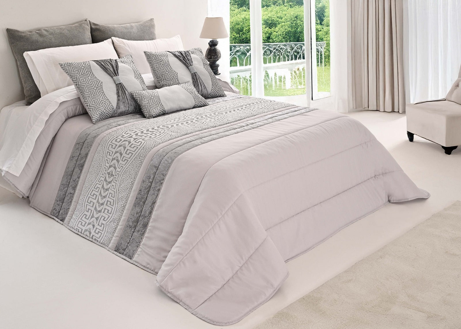 Colcha SUZY Elegante – Conjunto Decorativo con Tres Almohadas, 250 x 260 cm - COLOR GRIS CLARO