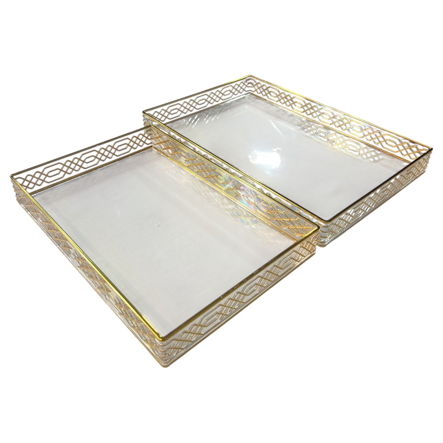 Este set de bandejas rectangulares destaca por su diseño elegante, con borde calado en color dorado que aporta un aire sofisticado y moderno. Fabricadas en un material plástico, resultan ligeras y muy prácticas para el uso diario sin renunciar a la apariencia distinguida.