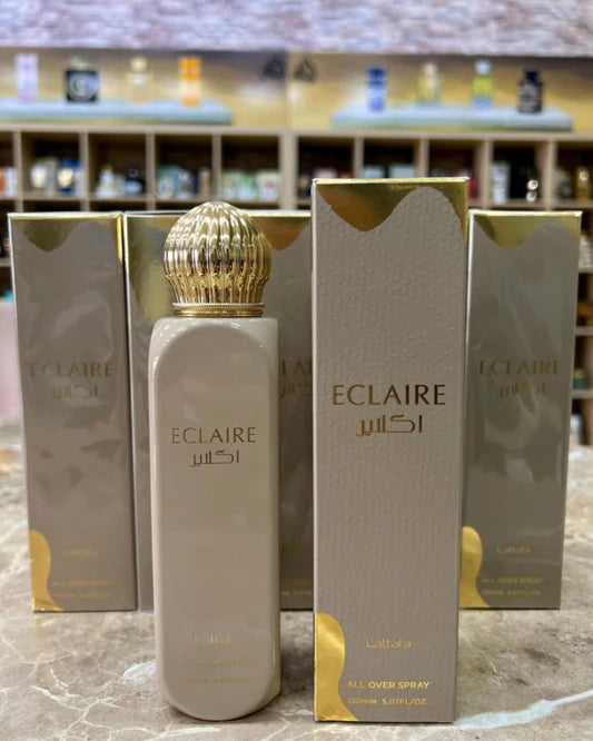 ✨ Lattafa Eclaire en formato spray corporal 150 ml perfuma y refresca con un halo adictivo de vainilla cremosa, caramelo suave y un guiño cítrico “pastelero” que recuerda a un éclair recién hecho. Su bruma ligera envuelve piel (y cabello, si lo deseas) con una estela dulce, cálida y reconfortante que acompaña durante horas sin resultar pesada.