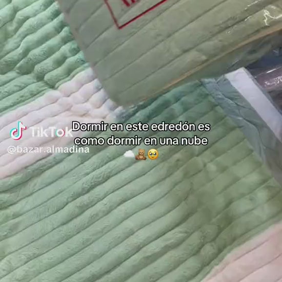 Sumérgete en el máximo confort con nuestro edredón aterciopelado con borreguito, diseñado para envolver tus noches en calidez y elegancia. Su exclusiva trama de canalé aporta un toque sofisticado y moderno, mientras que su interior de borrego ultra suave garantiza un descanso acogedor incluso en las noches más frías.