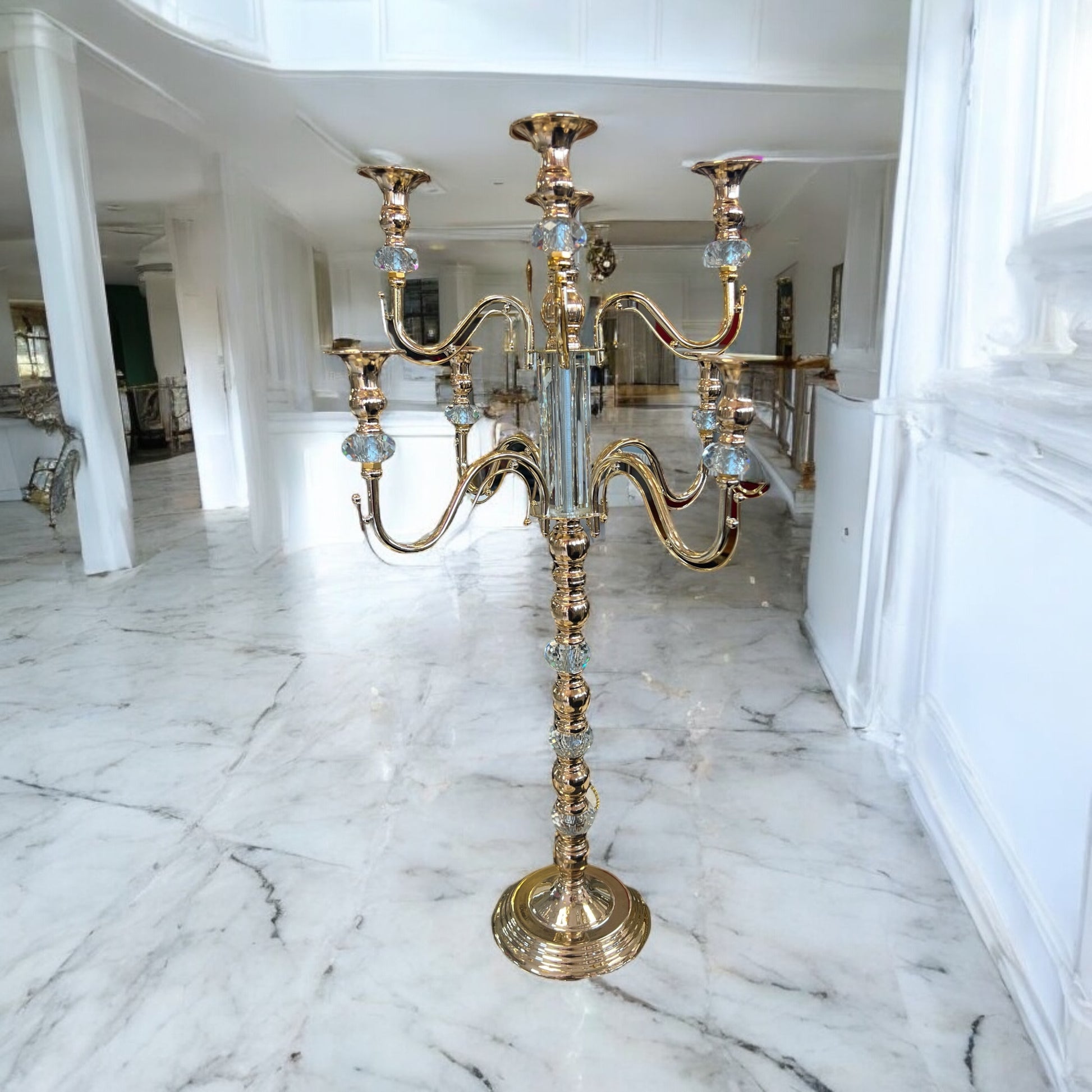Candelabro de Pie de 5 Brazos en Metal Dorado con Detalles de Cristal – 120 cm