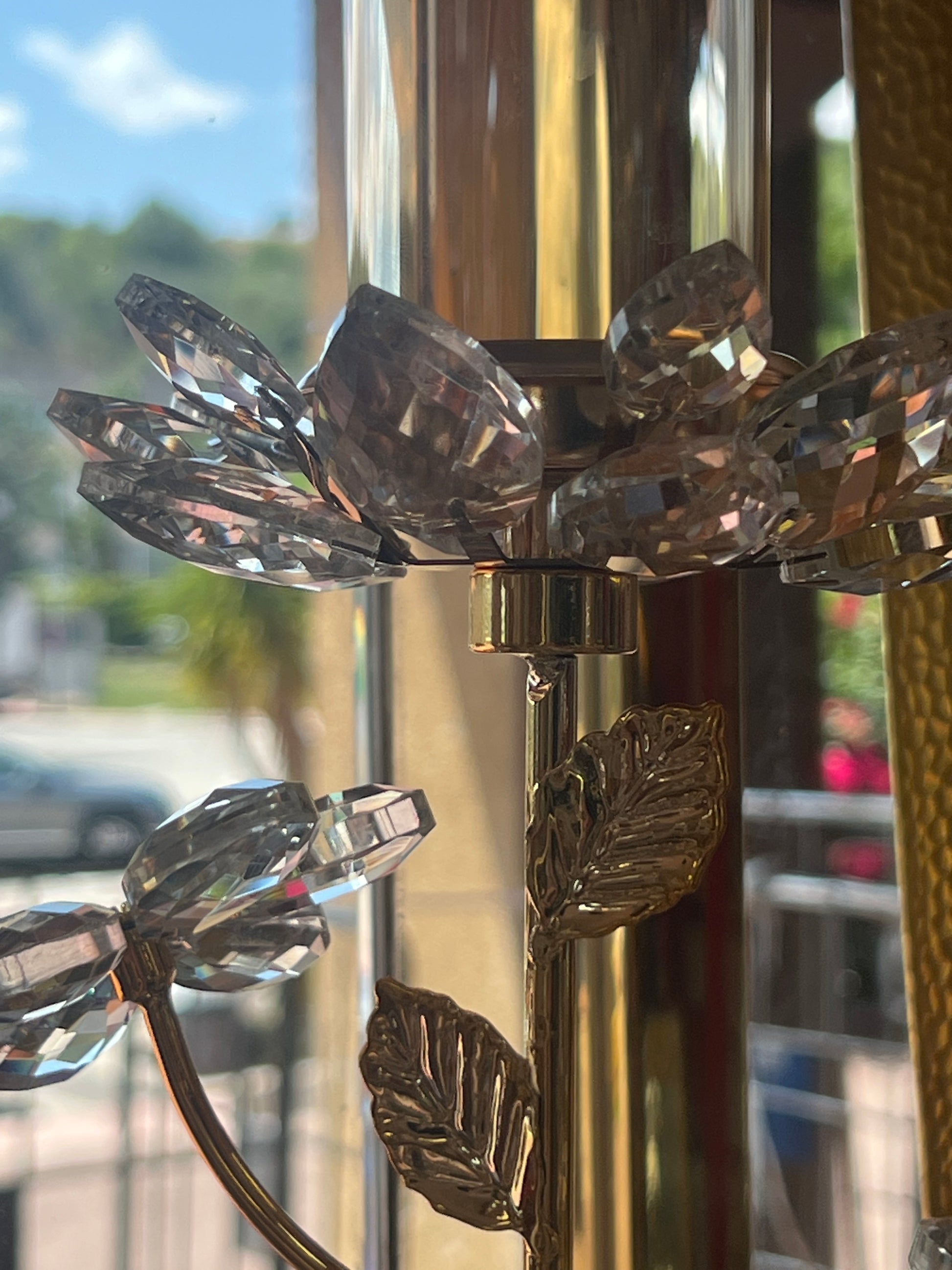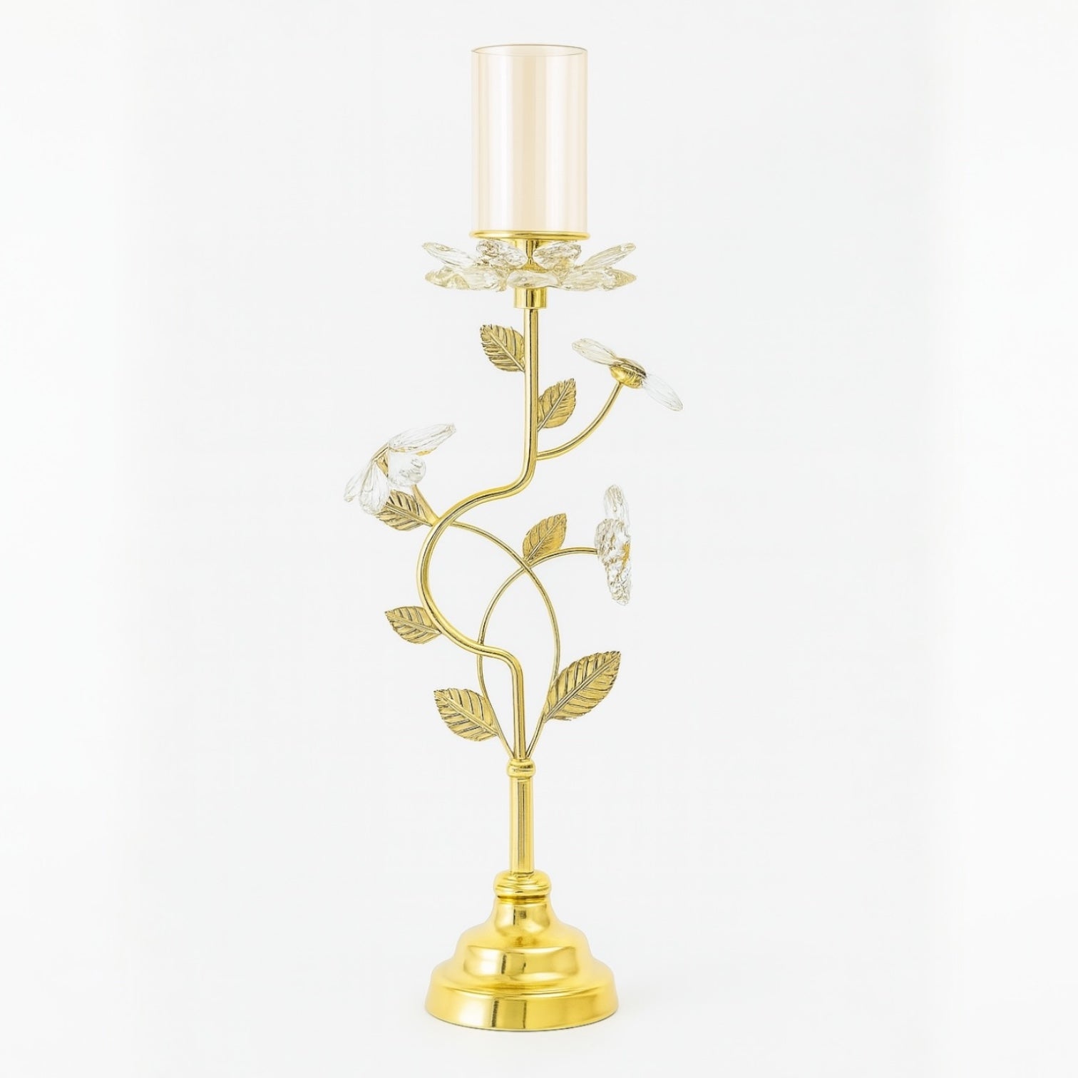 Este espectacular candelabro de 54 cm de altura es una pieza de decoración que combina lujo y sofisticación. Su estructura está fabricada en metal dorado de alta calidad, mientras que los delicados pétalos de flores están elaborados con vidrio transparente, creando un brillo elegante y refinado.