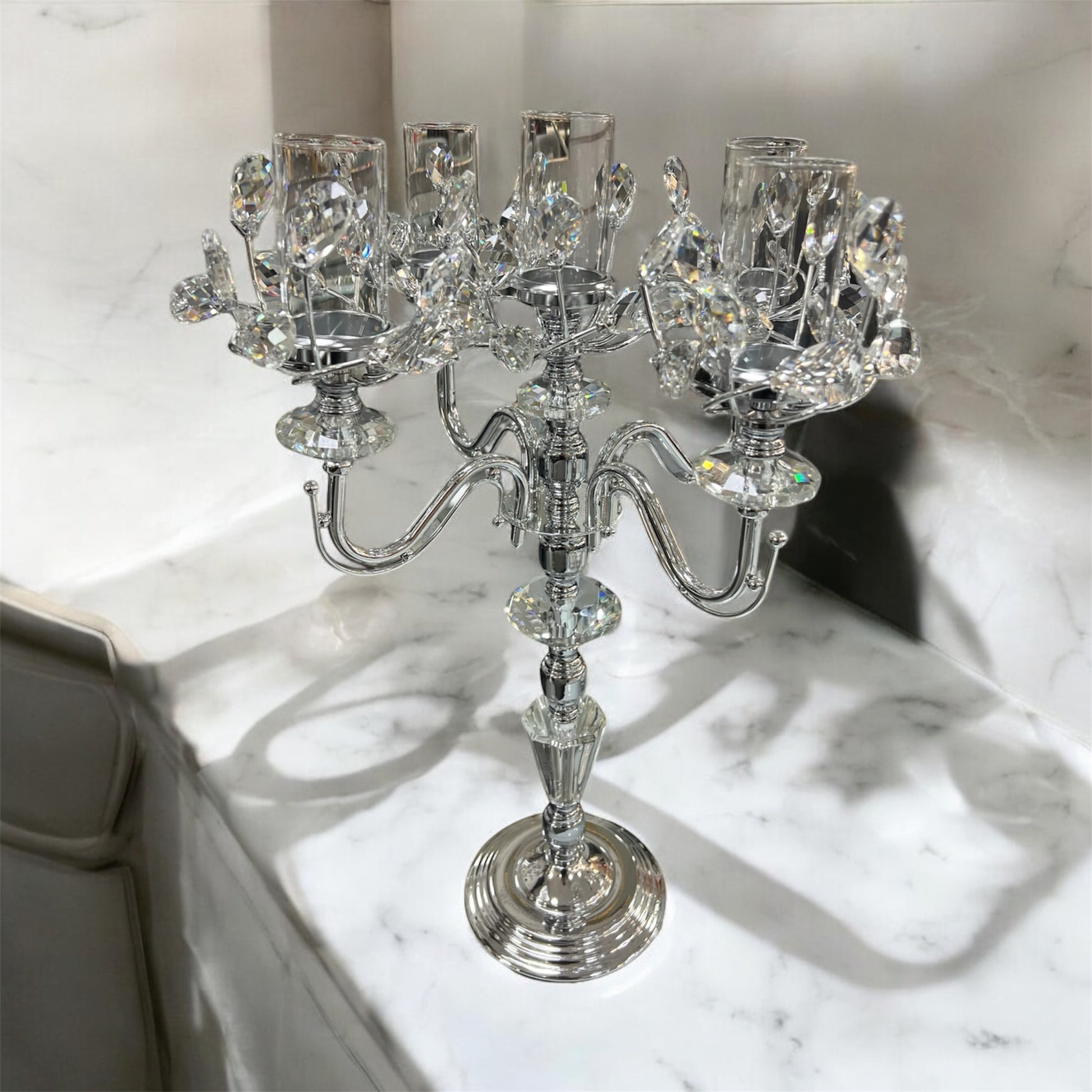 Candelabro de Cristal y Metal Plateado con 5 Brazos — Estilo Elegante y Moderno