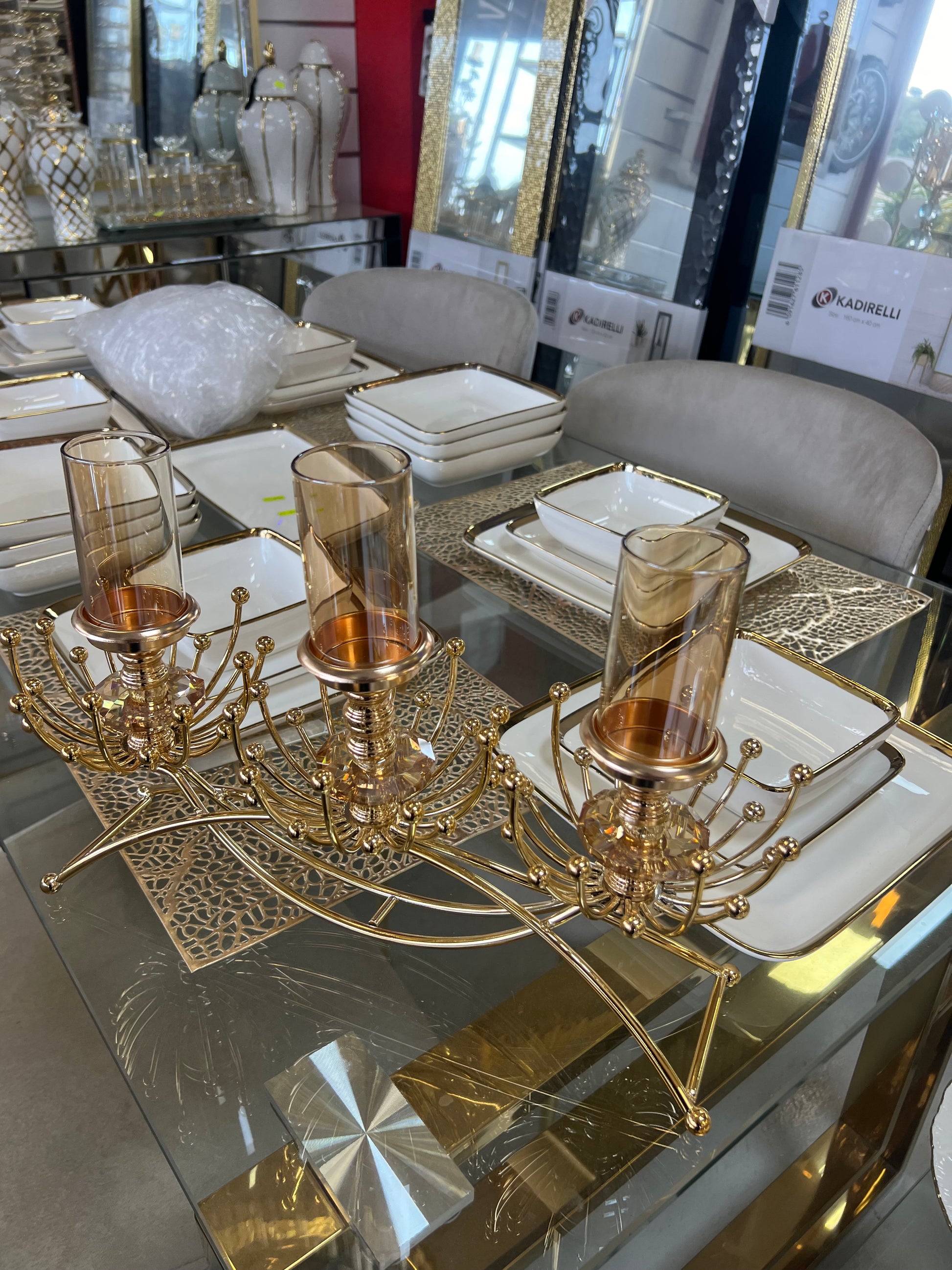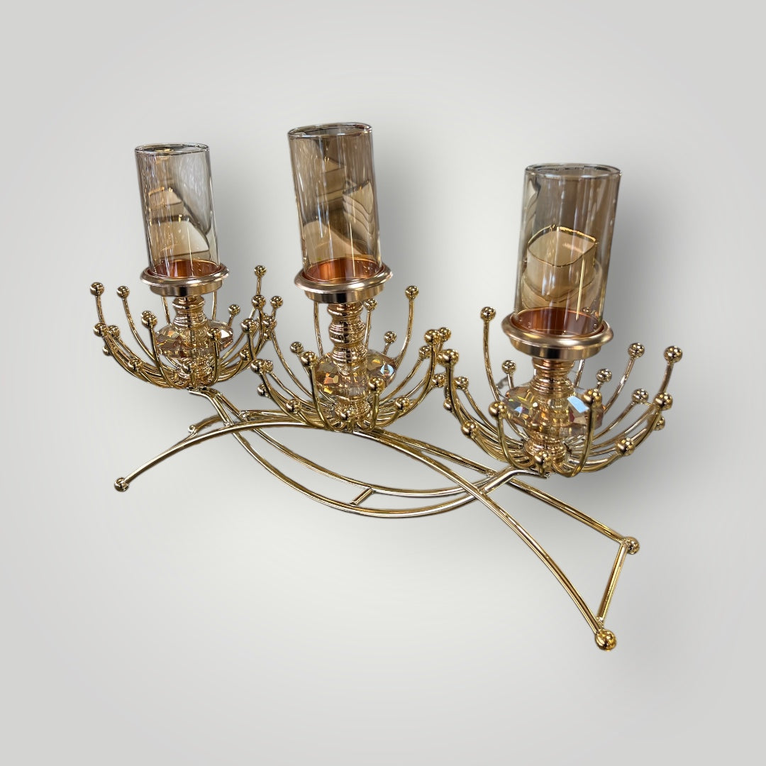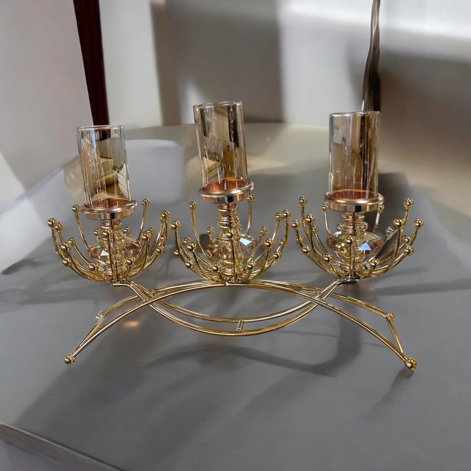 Candelabro Dorado de Cristal para 3 Velas – Centro de Mesa Elegante