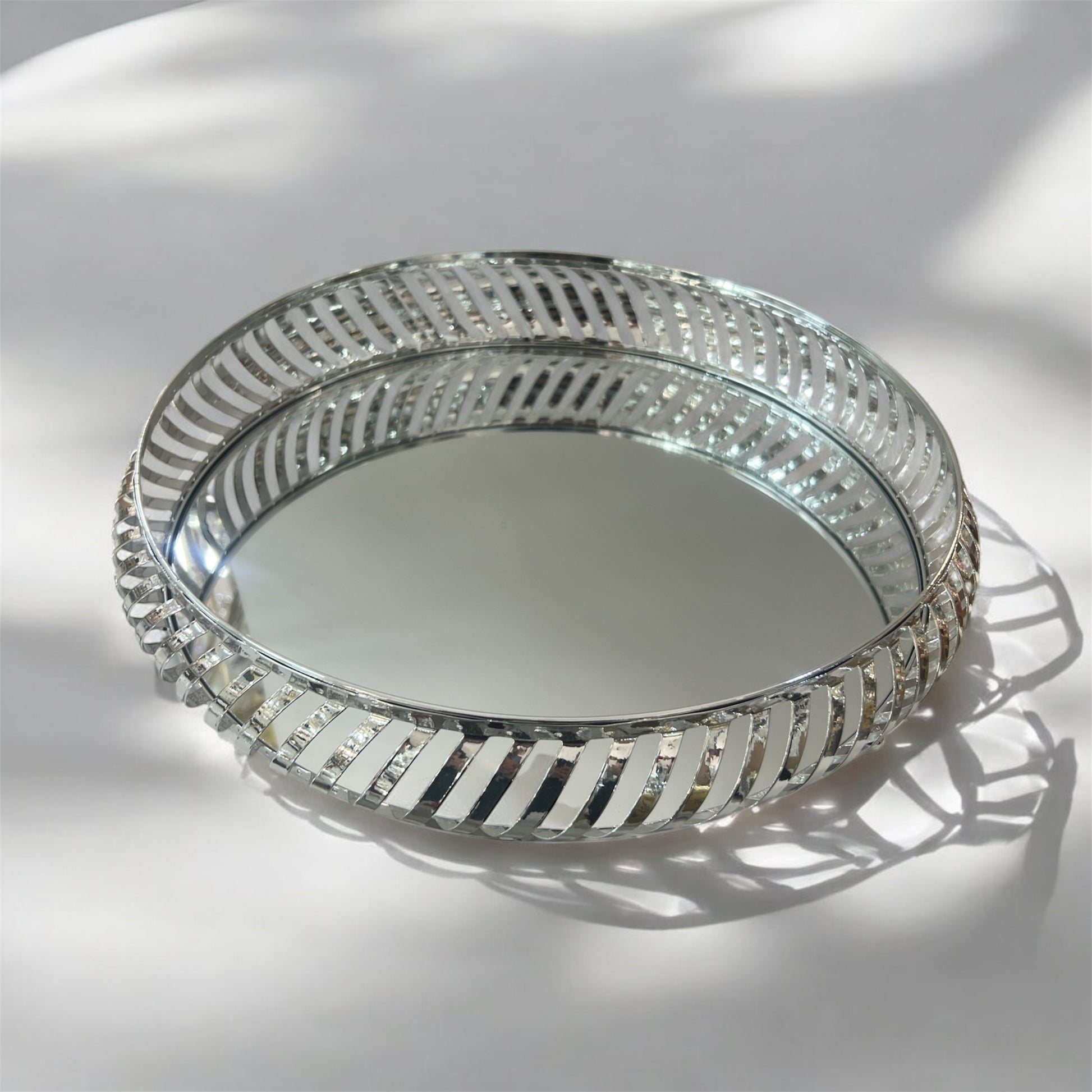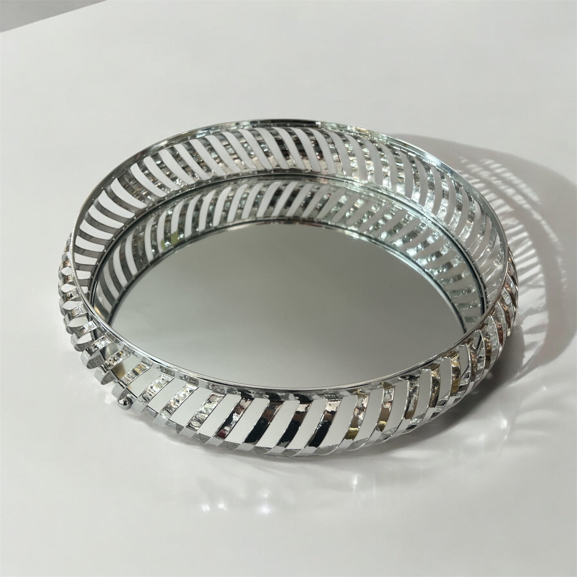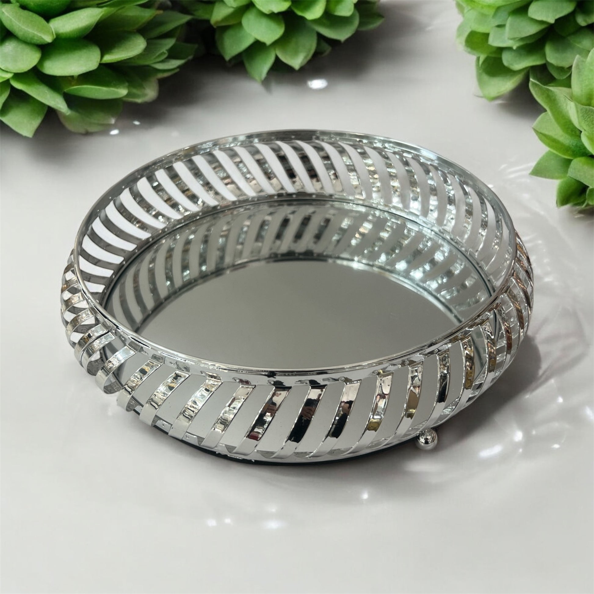 Centro de Mesa Redondo de Metal Plateado con Base de Espejo Decorativo