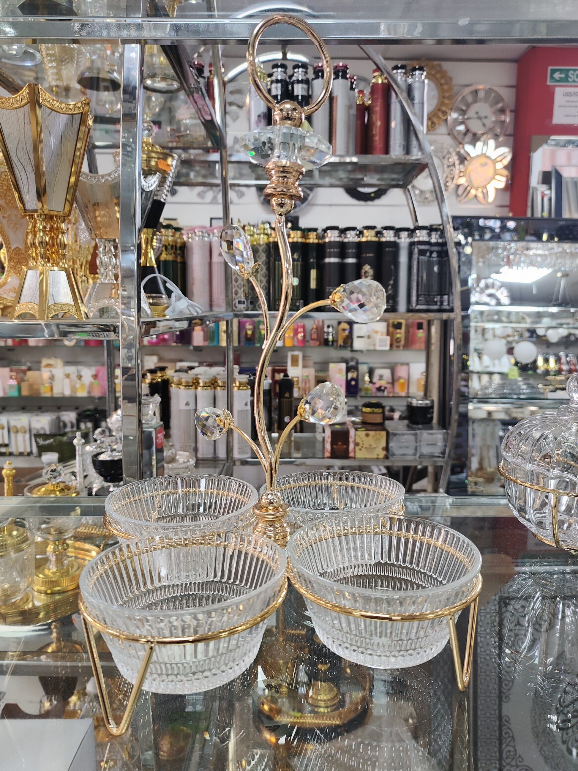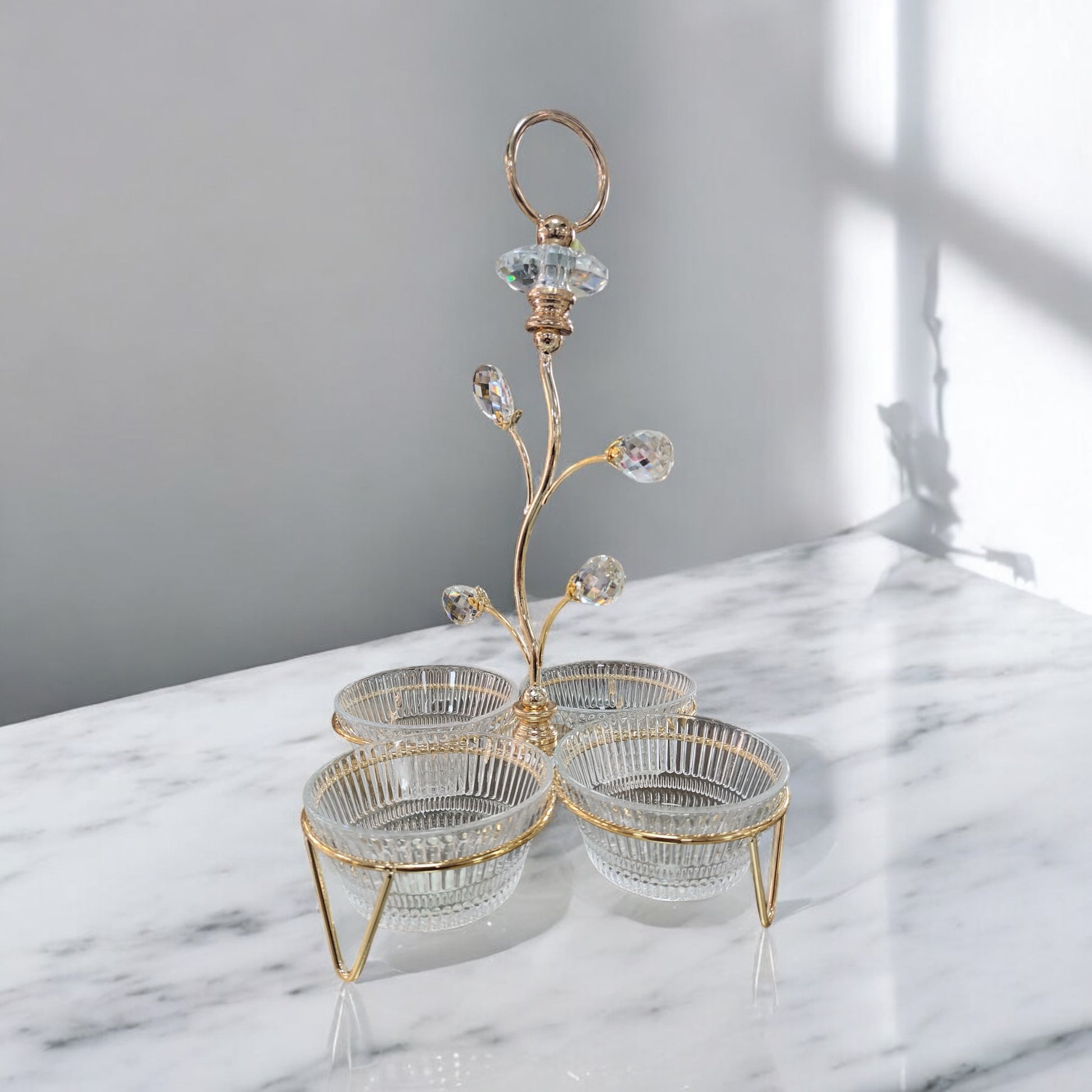 ✨💎 Añade un toque de lujo y sofisticación a tu mesa con esta bandeja decorativa dorada con 4 cuencos de cristal. Su estructura metálica dorada y su elegante adorno con cristales decorativos tipo diamante la convierten en una pieza perfecta para servir con estilo o decorar tu hogar.