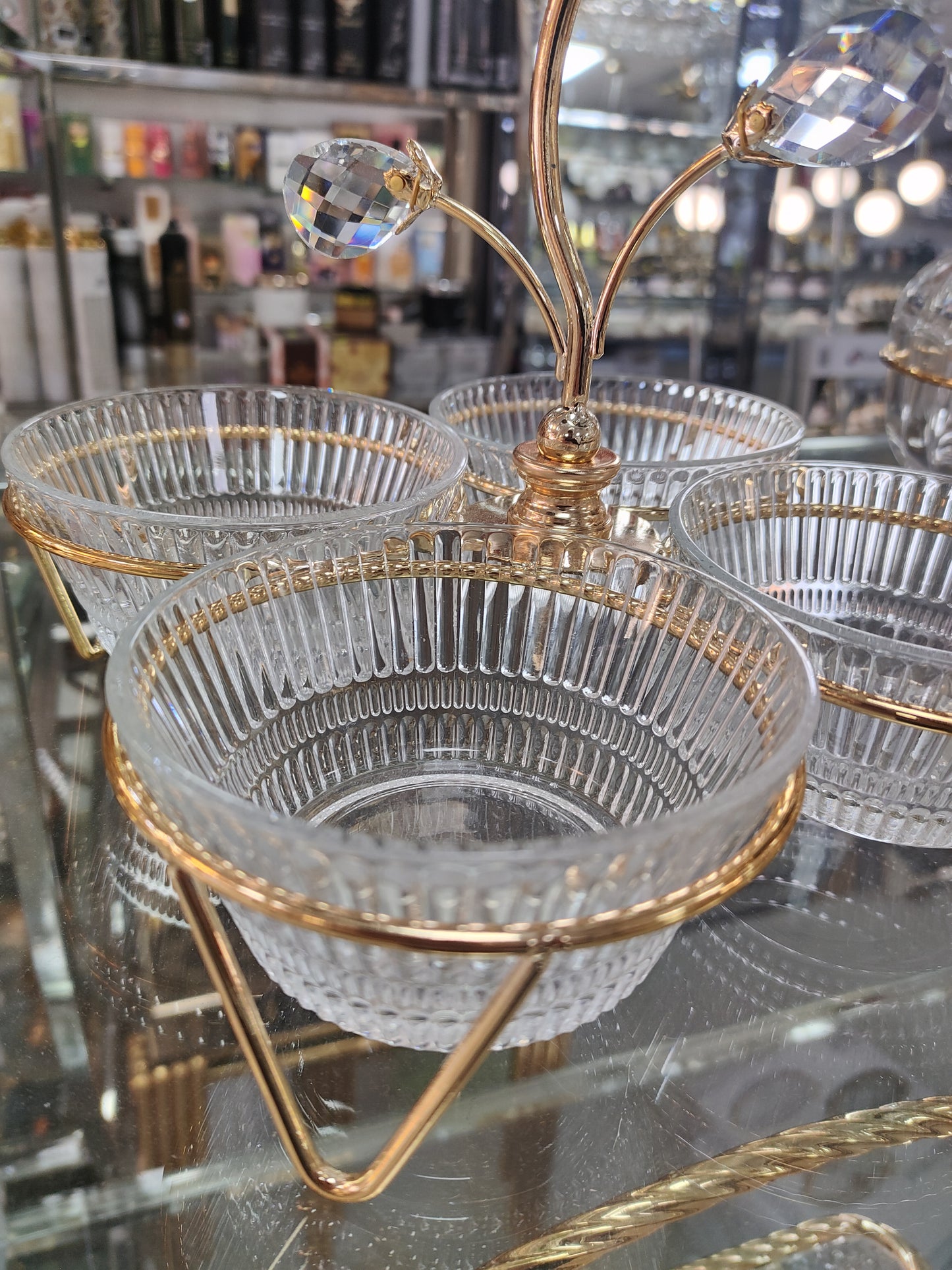 Bandeja Decorativa Dorada con 4 Cuencos de Cristal – Diseño Elegante con Detalles de Cristal