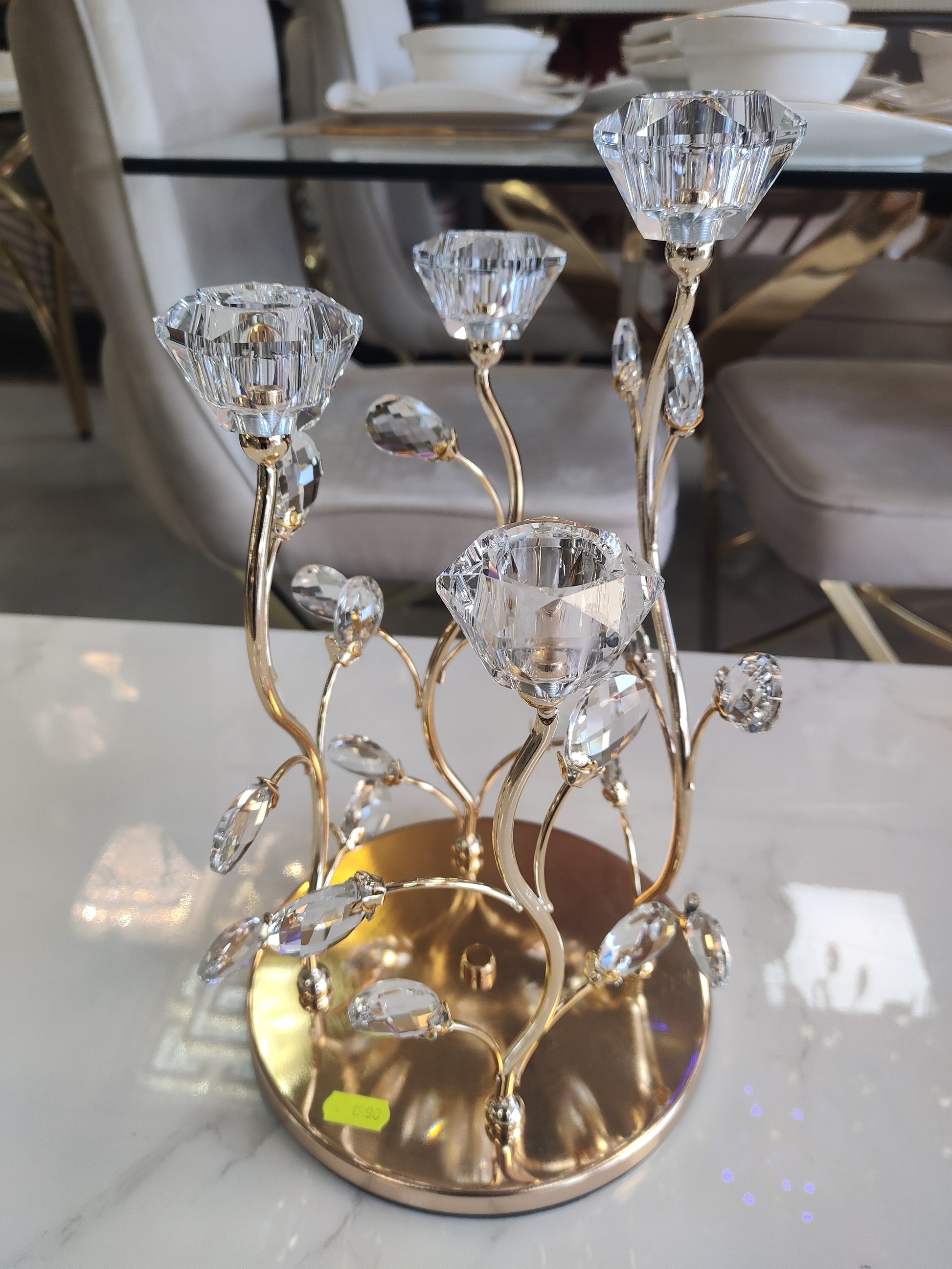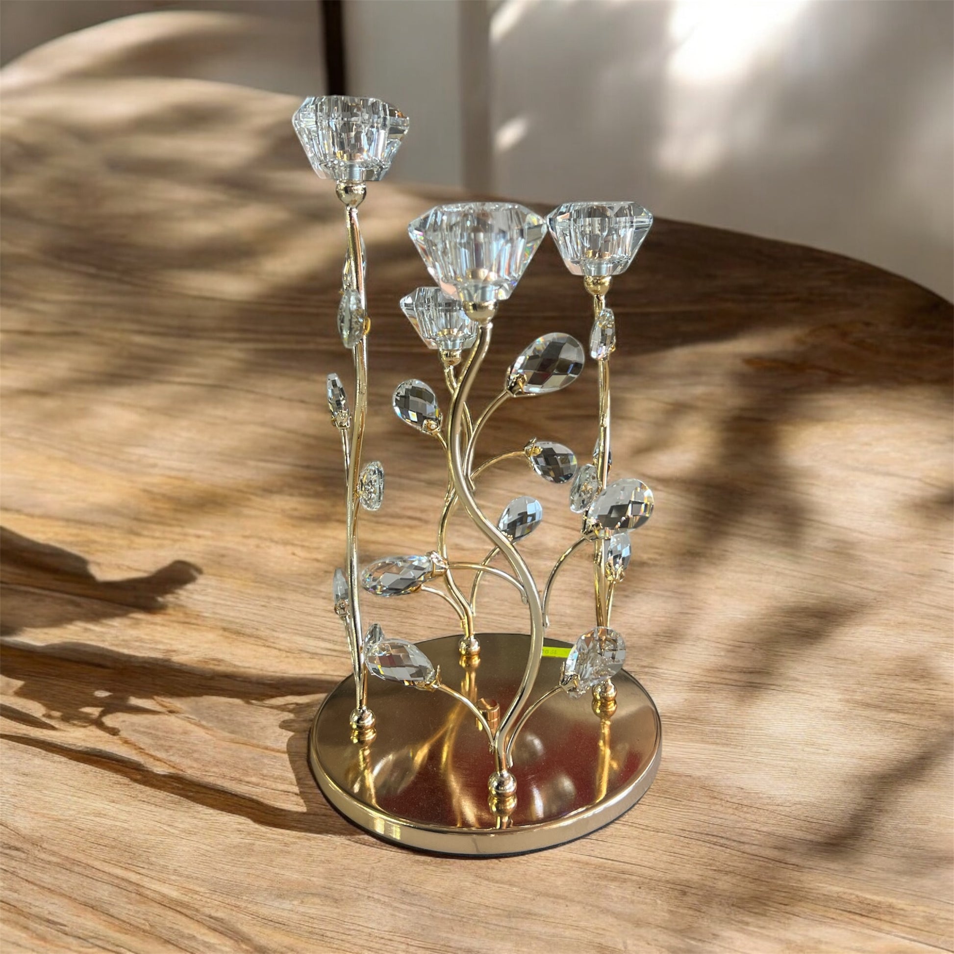 Candelabro de Cristal con Base Dorada — Diseño Floral Elegante para Decoración de Lujo
