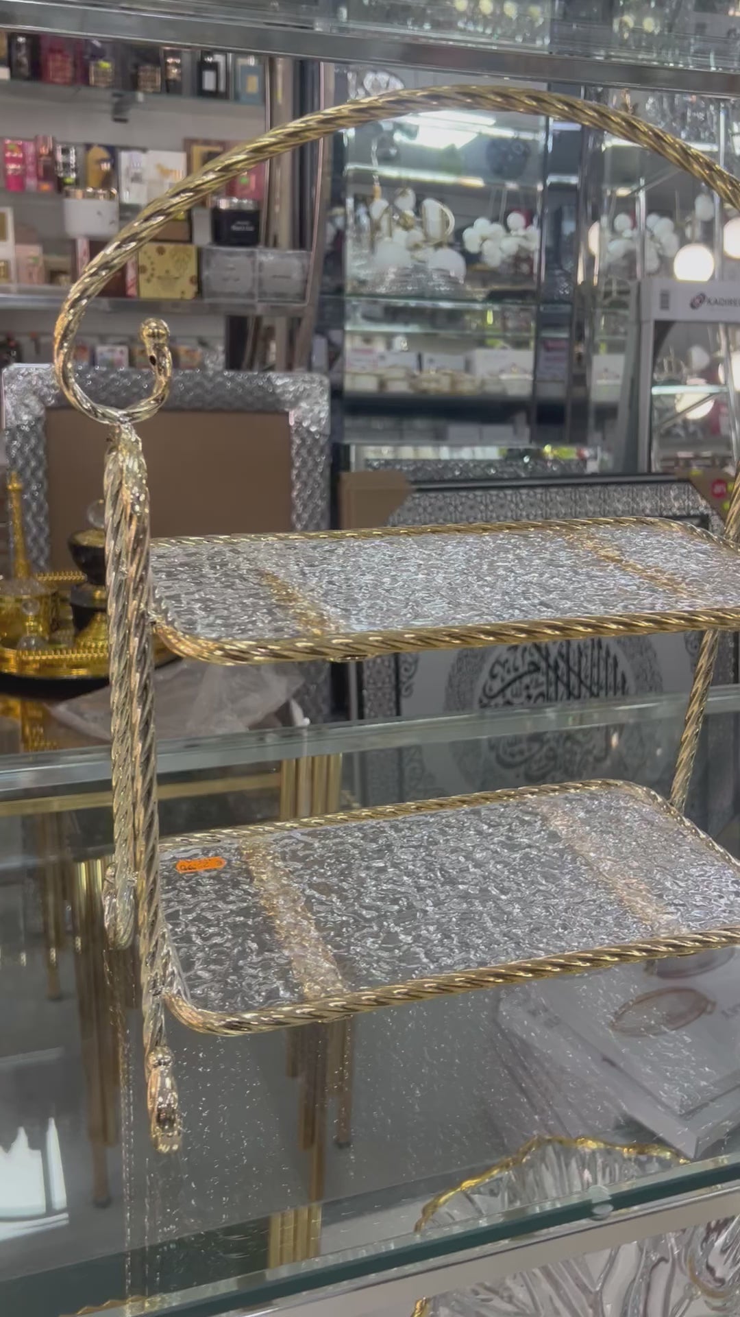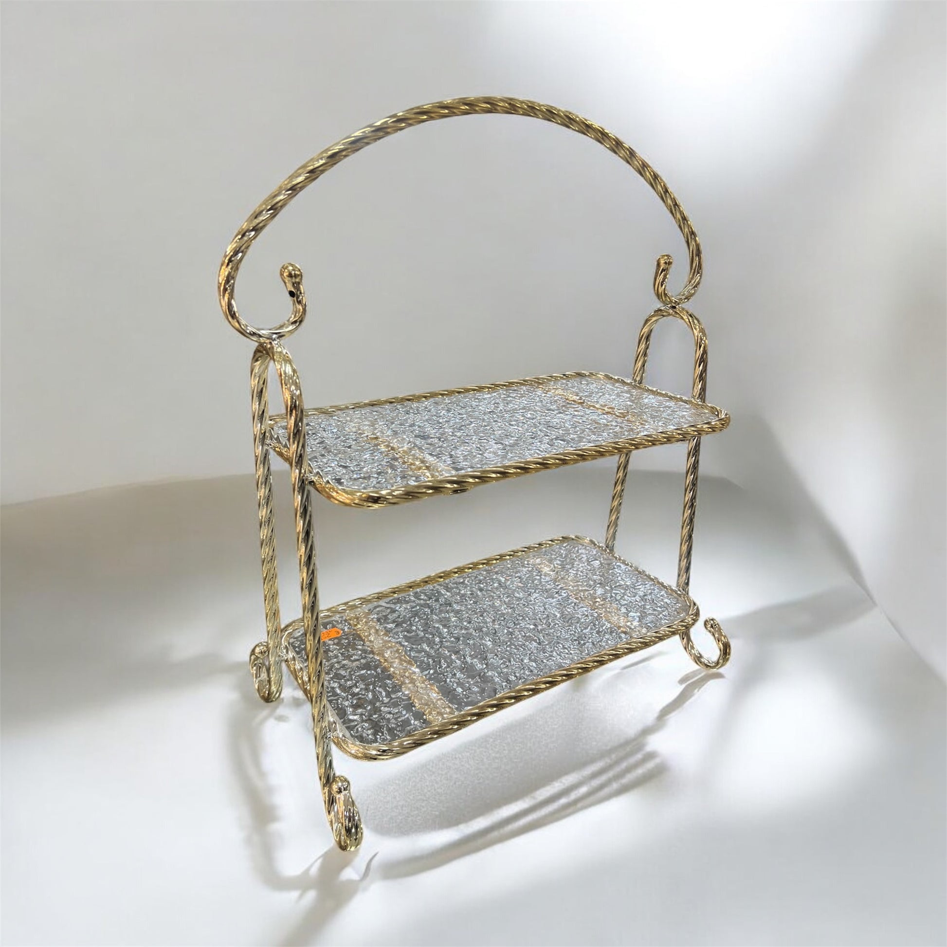 🏷 Bandeja Decorativa de 2 Pisos con Estructura Dorada y Cristal Texturizado – Estilo Clásico y Elegante