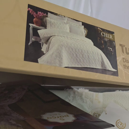 El Juego de Cama Cher - Gelin Seti de Golden Home es un set de alta gama diseñado para aportar un toque de lujo y sofisticación a tu habitación. Inspirado en la delicadeza y el romanticismo, este conjunto es ideal para novias o para quienes buscan un diseño elegante y atemporal en su dormitorio.