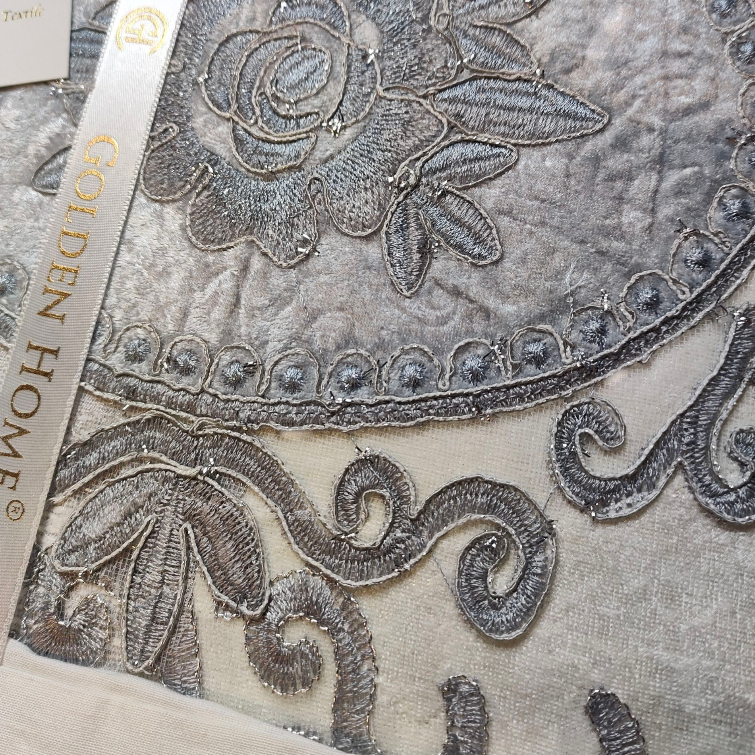 El Juego de Cama "Clouds" destaca por su diseño ornamental inspirado en los patrones barrocos, con detalles bordados en tonos sutiles que le otorgan una apariencia sofisticada y atemporal. La combinación de su estampado simétrico con un fondo de efecto degradado crea una sensación de lujo y exclusividad, ideal para un dormitorio refinado.