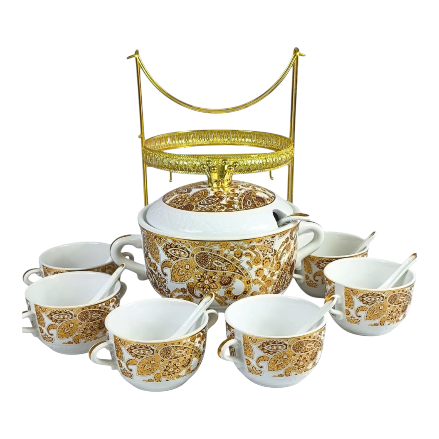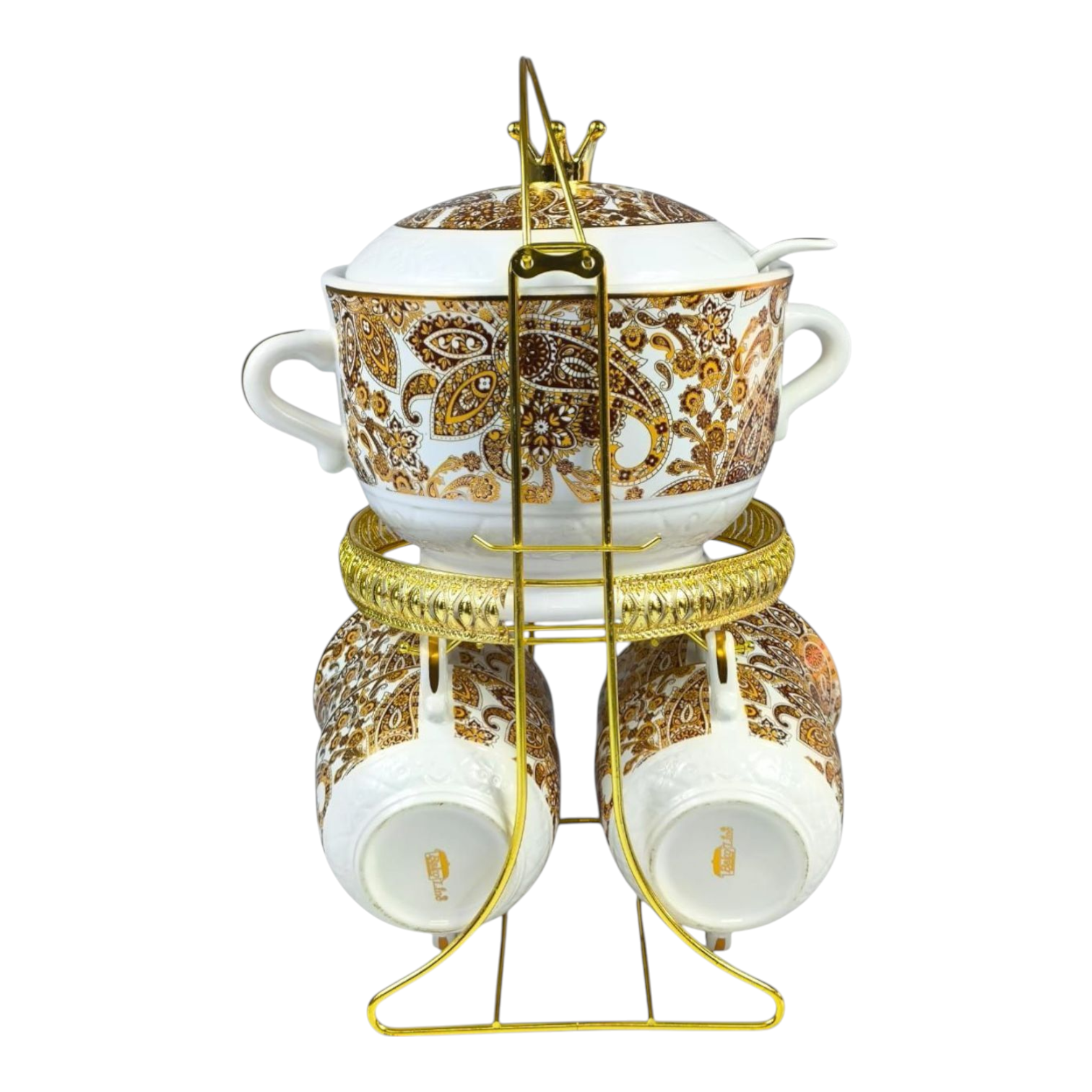 🍲 Set de Sopa de Cerámica con Detalles Dorados – 11 Piezas con Soporte ✨