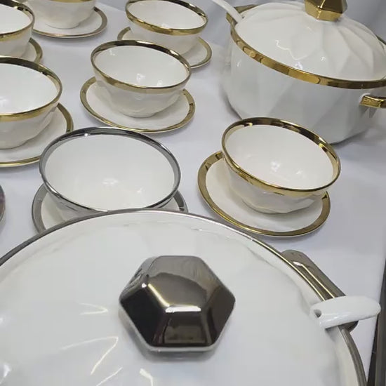 Eleva la experiencia de tu mesa con este exclusivo juego de vajilla de porcelana blanca con detalles dorados, ideal para quienes buscan elegancia, sofisticación y estilo en cada comida. Su diseño moderno con acabado brillante lo convierte en el complemento perfecto tanto para ocasiones especiales como para el uso diario de alto nivel. ✨