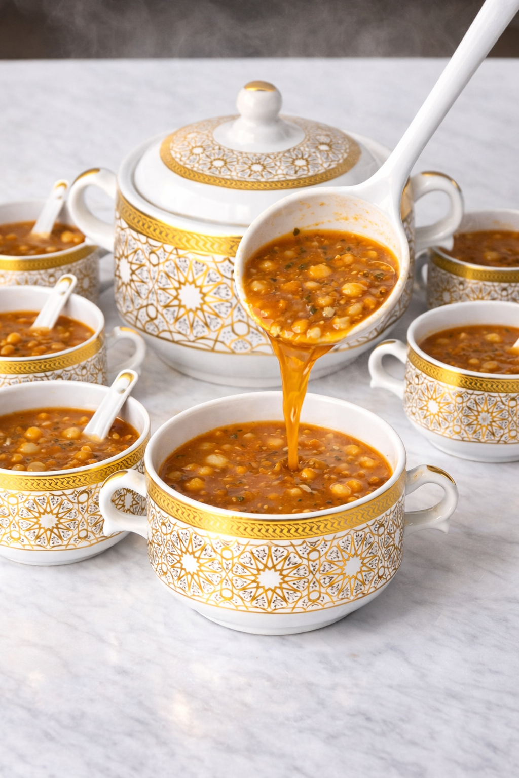 Sopera de Porcelana Blanca con Detalles Dorados y 6 Cuencos con Cucharas – 2,7L-Diseño Geométrico Árabe