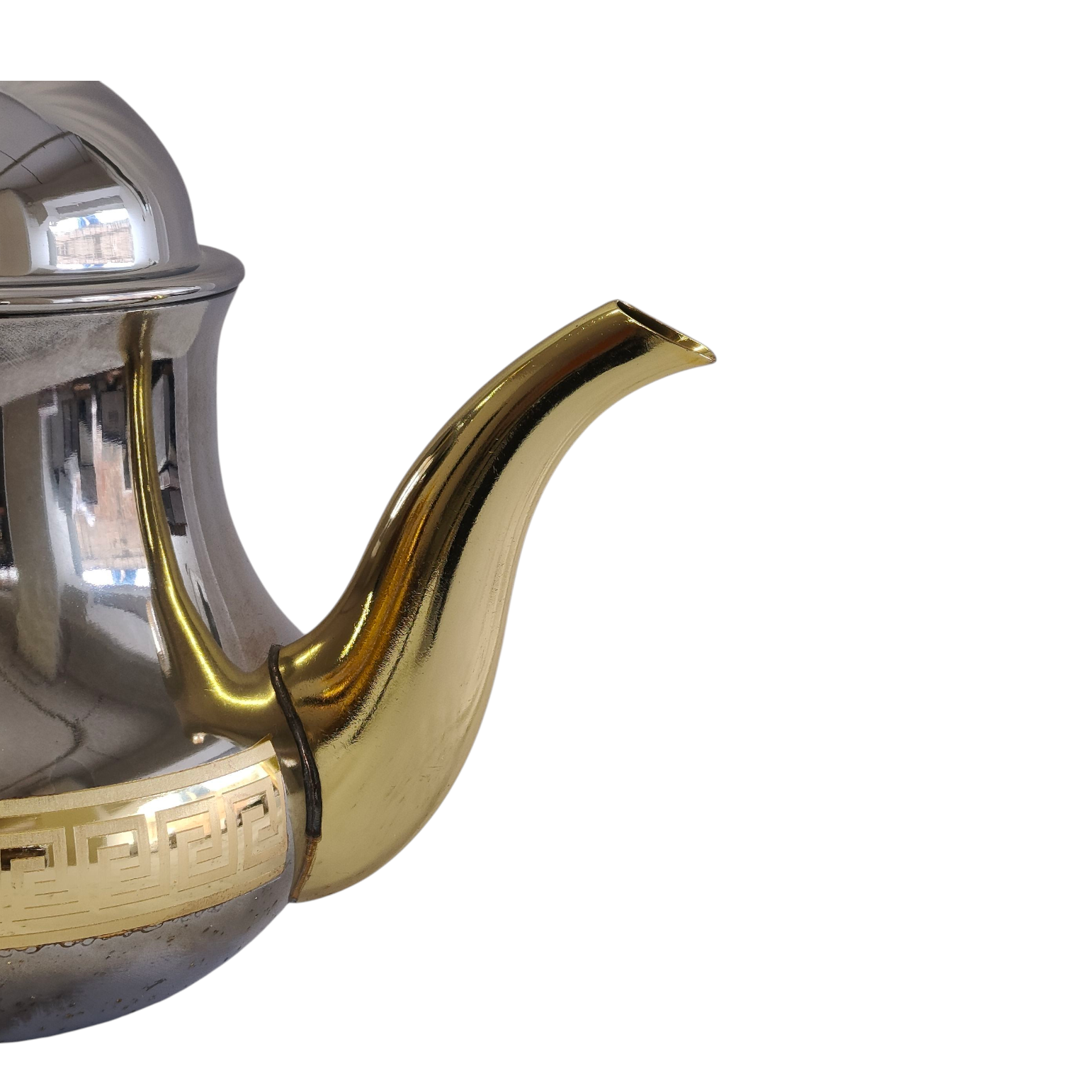 Tetera marroquí de acero inoxidable con detalles dorados, tapa con bisagra y pico antigoteo