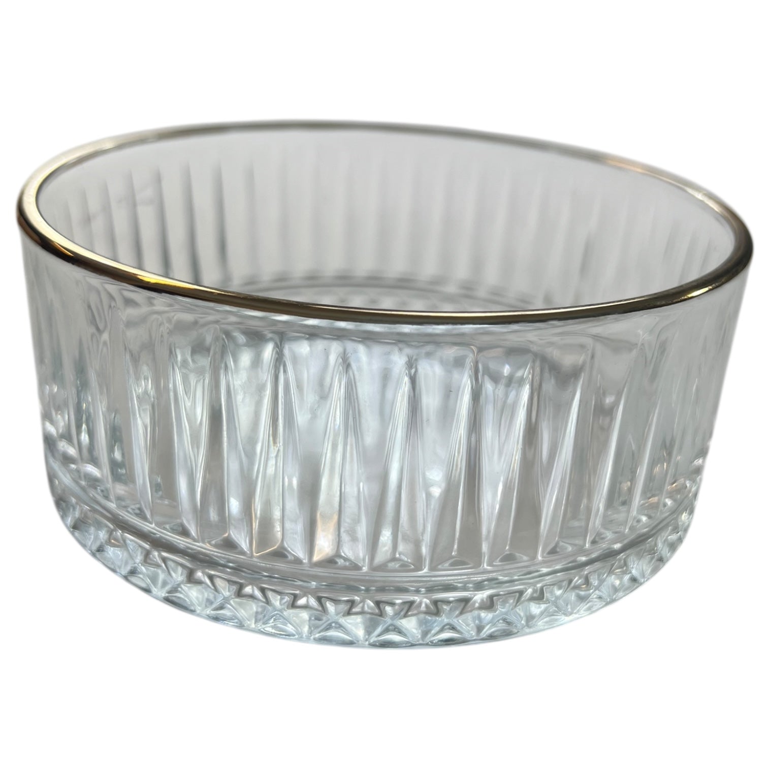 Descubre este elegante cuenco de cristal, con capacidad aproximada de 270 ml, diseñado con un patrón vertical grabado que aporta textura y sofisticación, rematado con un fino borde dorado que le da un plus de distinción y estilo. Perfecto para servir ensaladas, postres, frutas o aperitivos con un toque premium y moderno.