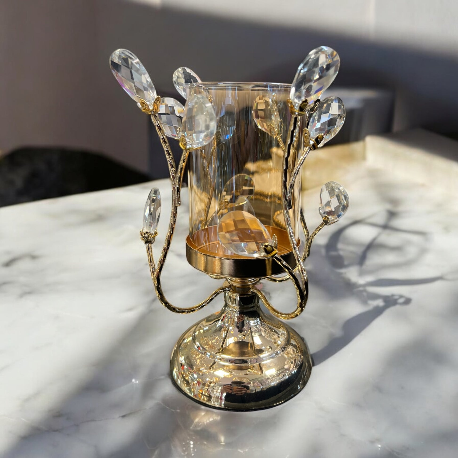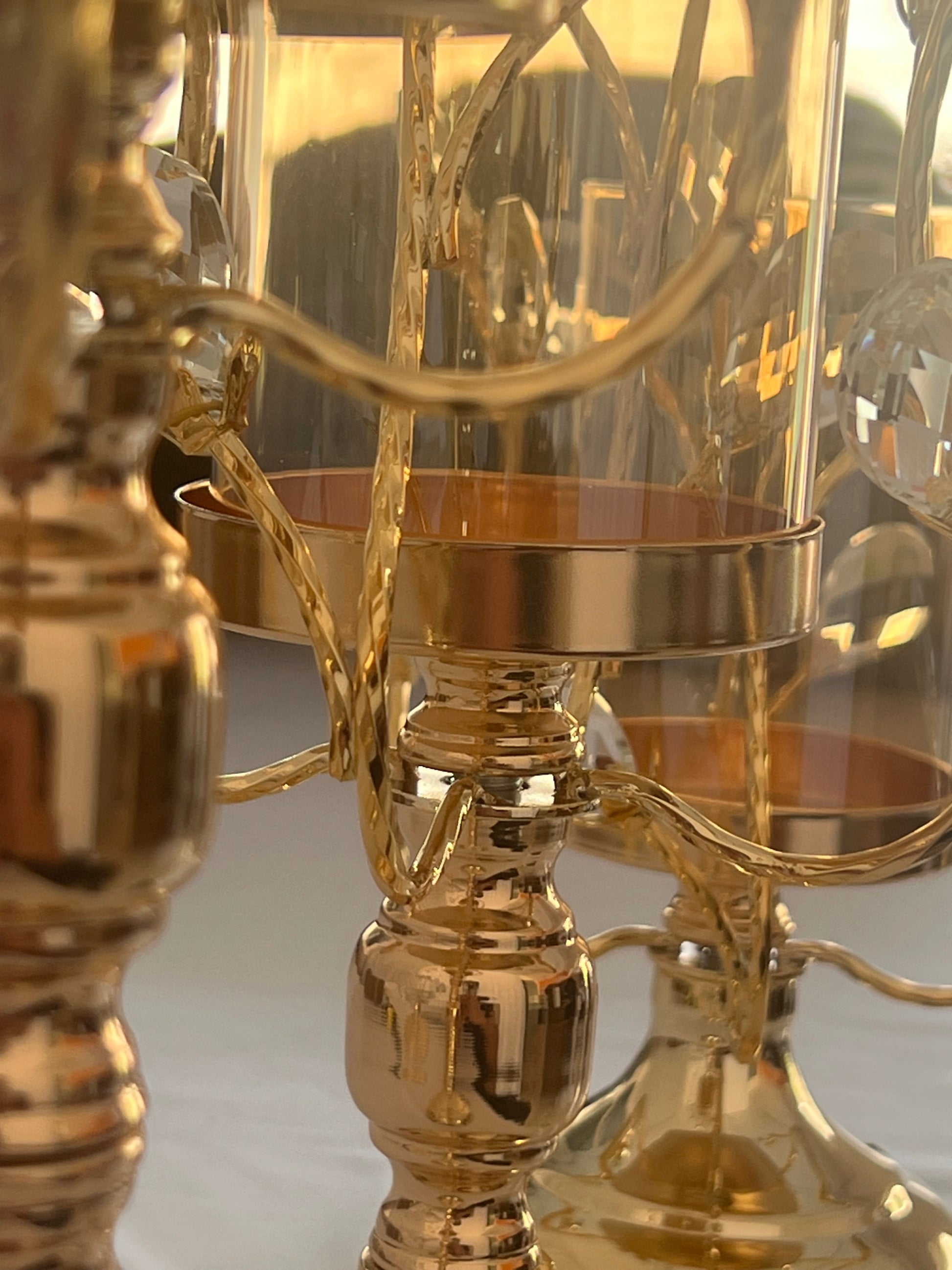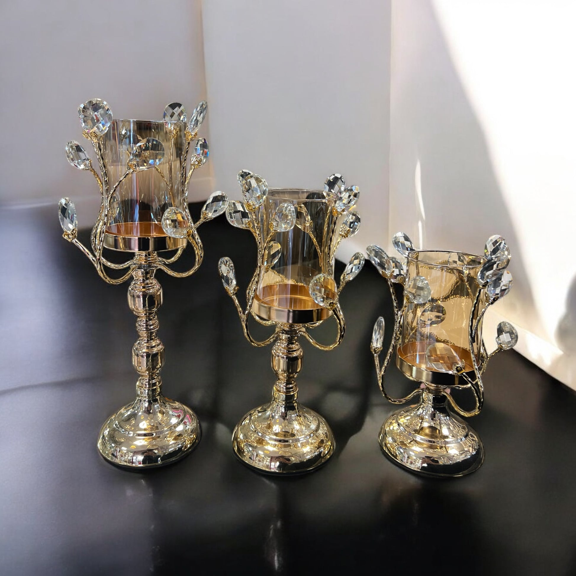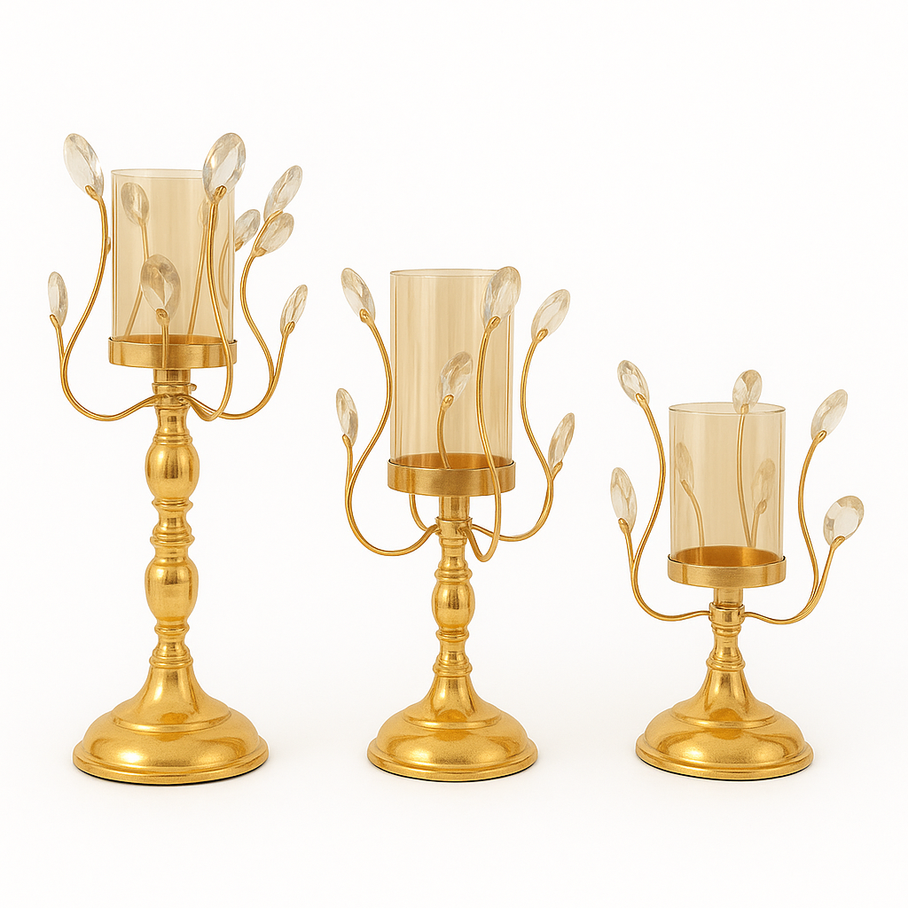 Este set de tres candelabros decorativos es perfecto para dar un toque elegante a cualquier rincón de tu hogar, eventos o celebraciones. Cada pieza tiene una estructura dorada muy bien trabajada, con detalles en forma de pétalos hechos de vidrio que brillan con la luz y dan un efecto visual muy bonito.