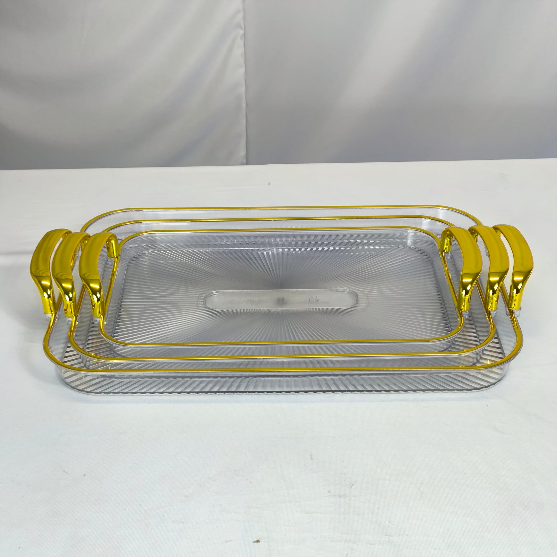 Conjunto de 3 tabuleiros de plástico com pegas douradas – Luxo e estilo para servir.