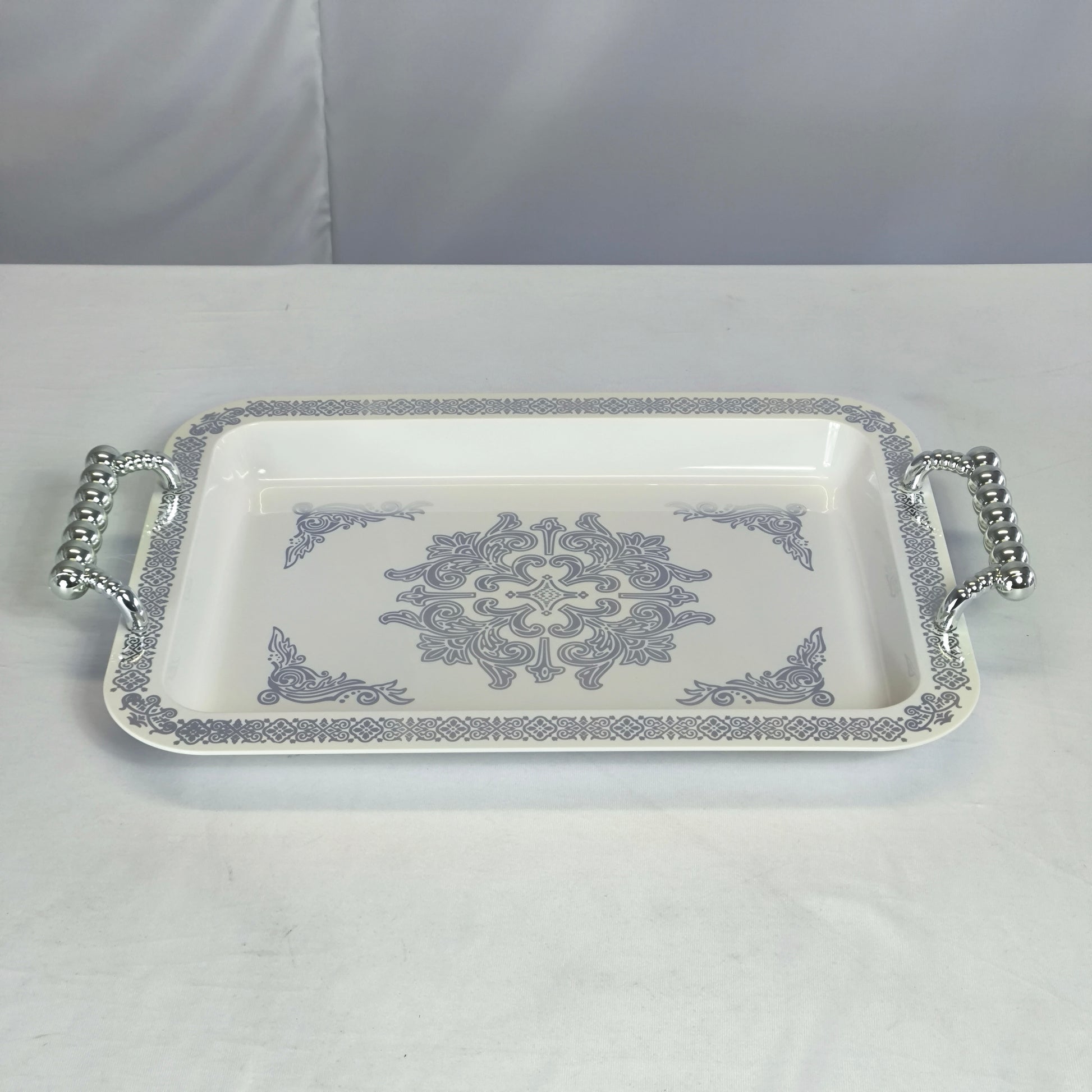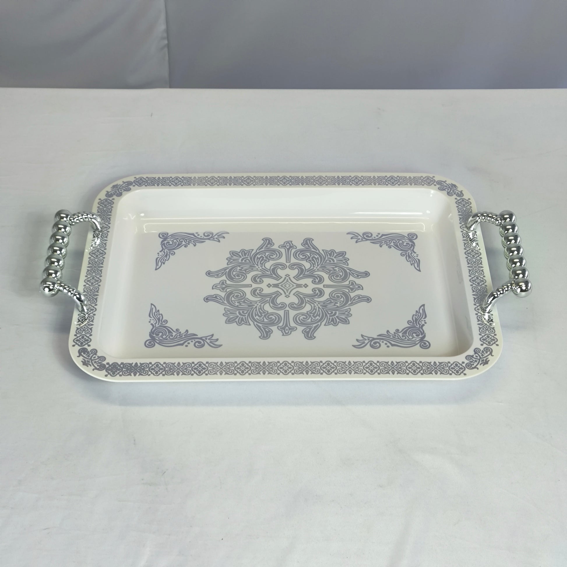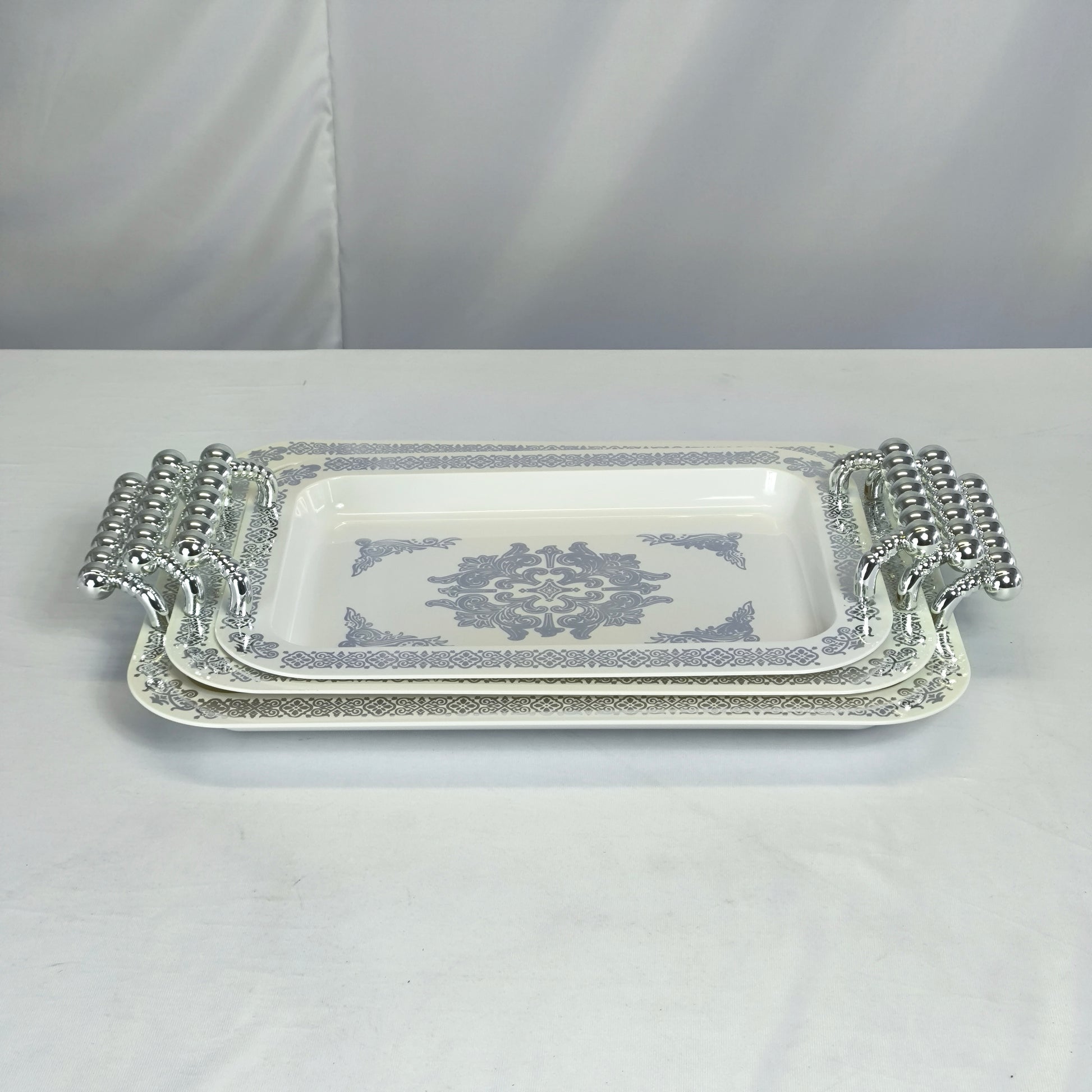 Sirva com estilo e impressione em todas as ocasiões. Este conjunto de 3 bandejas de porcelana com pegas prateadas é ideal para mesas elegantes e celebrações.