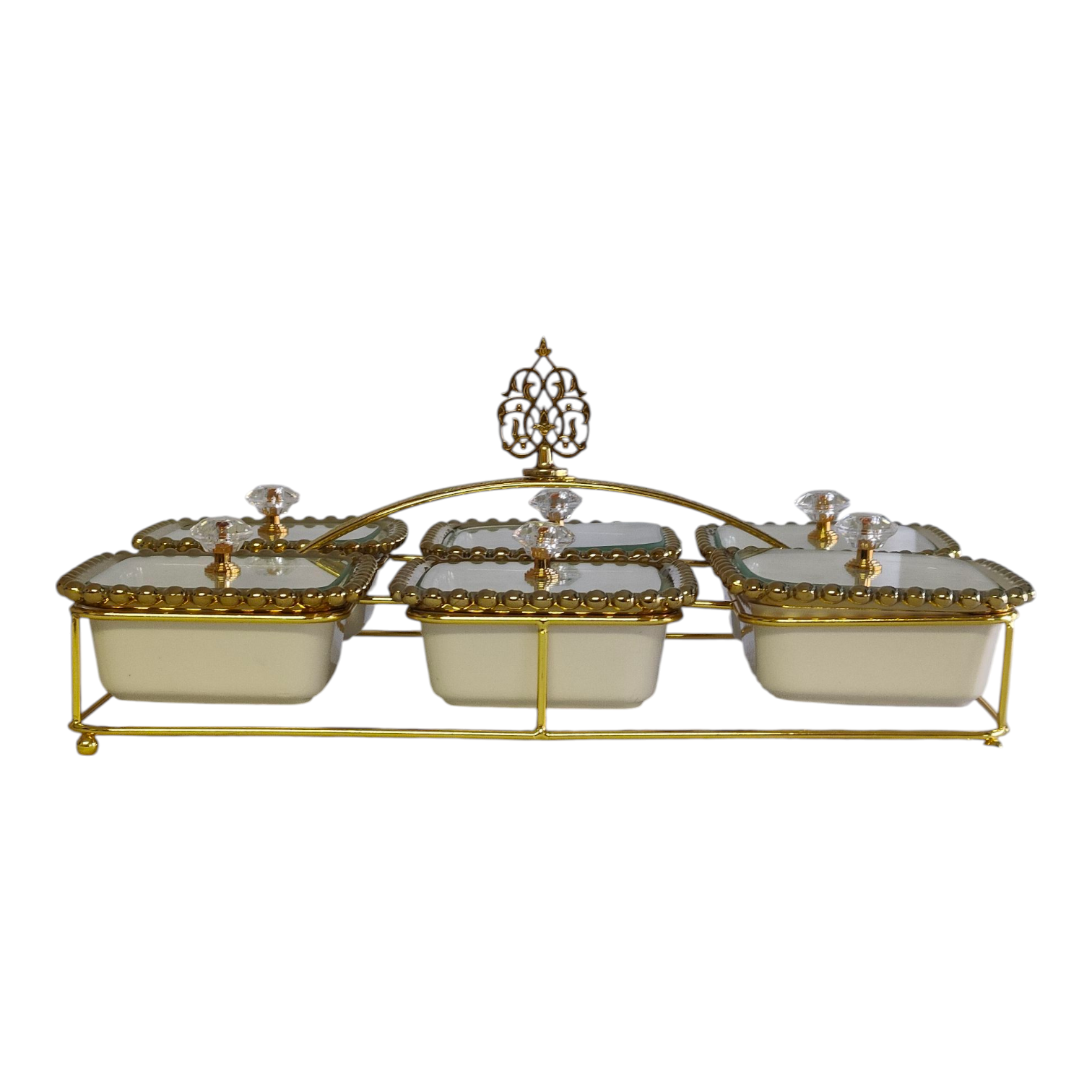 Este set de 6 recipientes con tapas de cristal y bandeja dorada combina lujo y practicidad, ideal para servir condimentos, especias o frutos secos con estilo 💛. Perfecto para ocasiones especiales o para decorar tu mesa diaria.