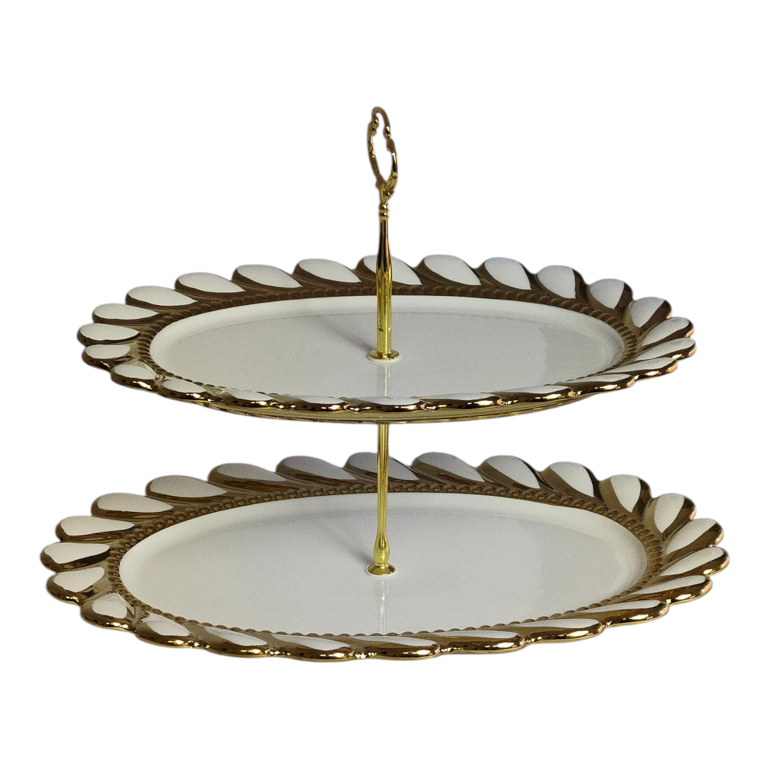 🍰 Suporte para Bolo de Porcelana de Dois Andares com Borda Dourada — Elegância e Estilo para a Sua Mesa ✨