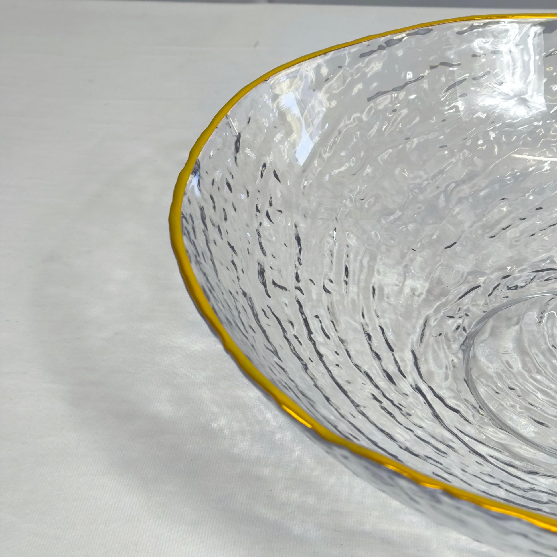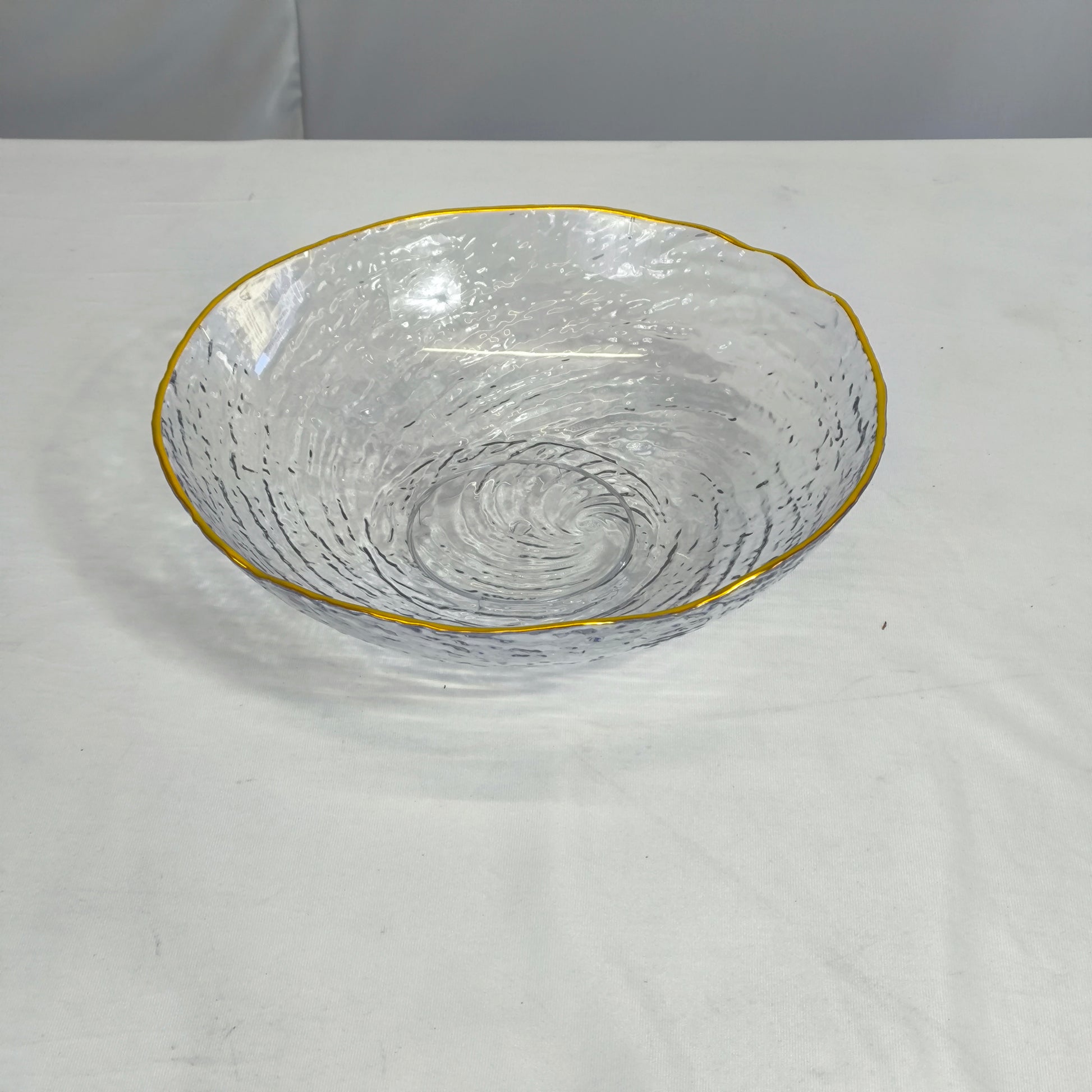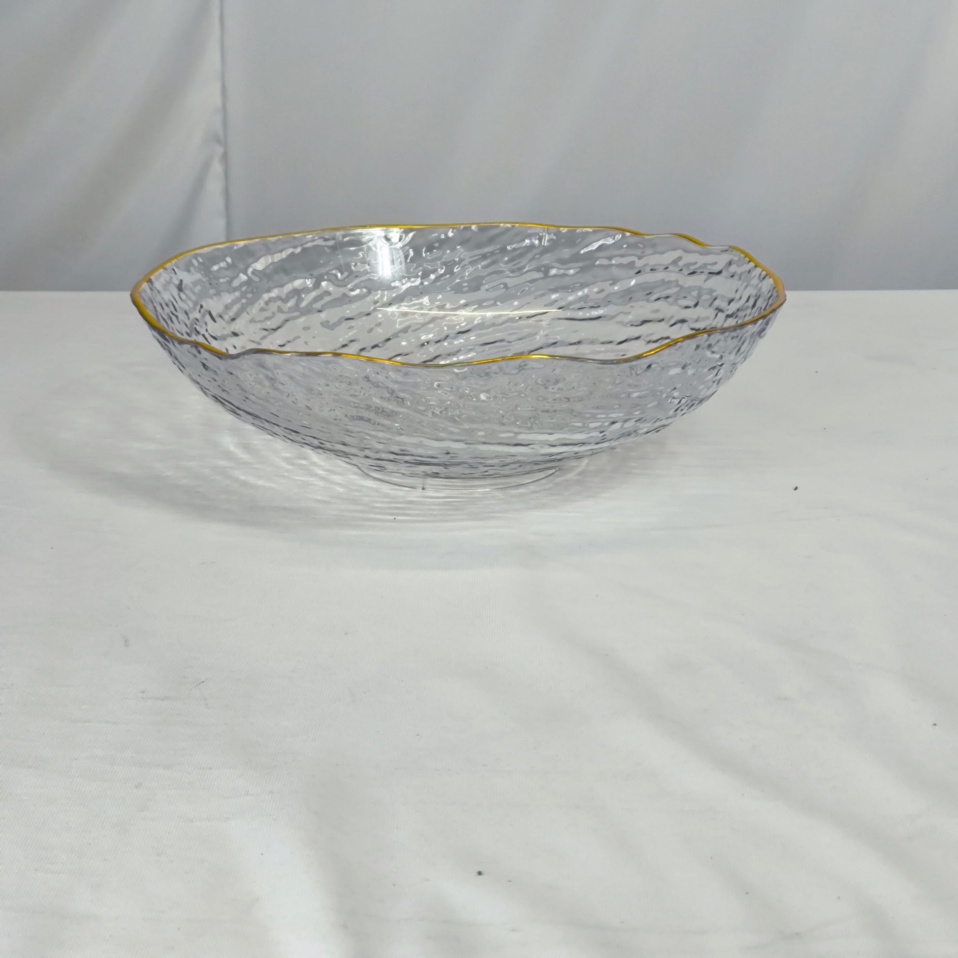 Esta taça de vidro com textura martelada e rebordo dourado transforma qualquer mesa numa peça de decoração elegante. Perfeita para o uso diário ou ocasiões especiais.